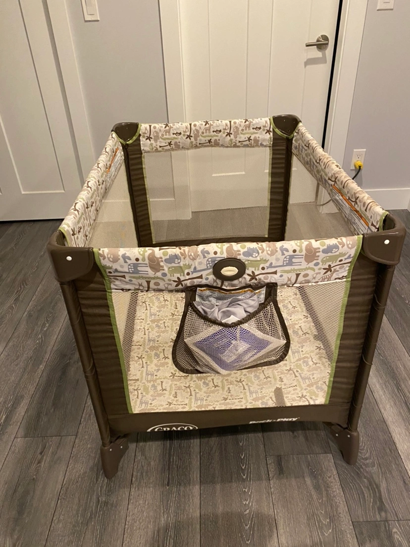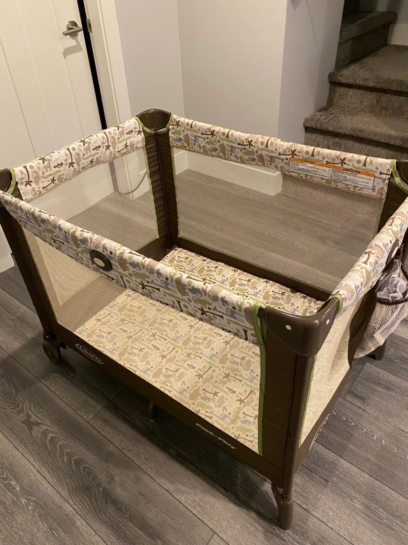 Graco Pack 'n Play playard with a jungle print. Includes a carrying case . Good condition.only use a couple times for Company