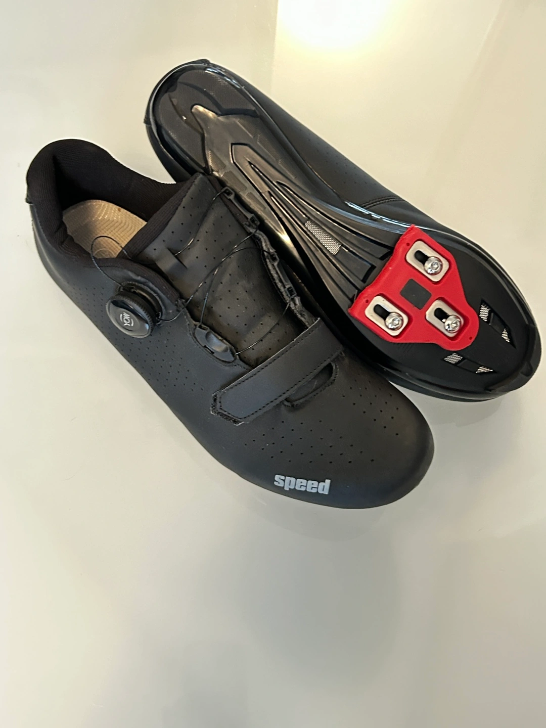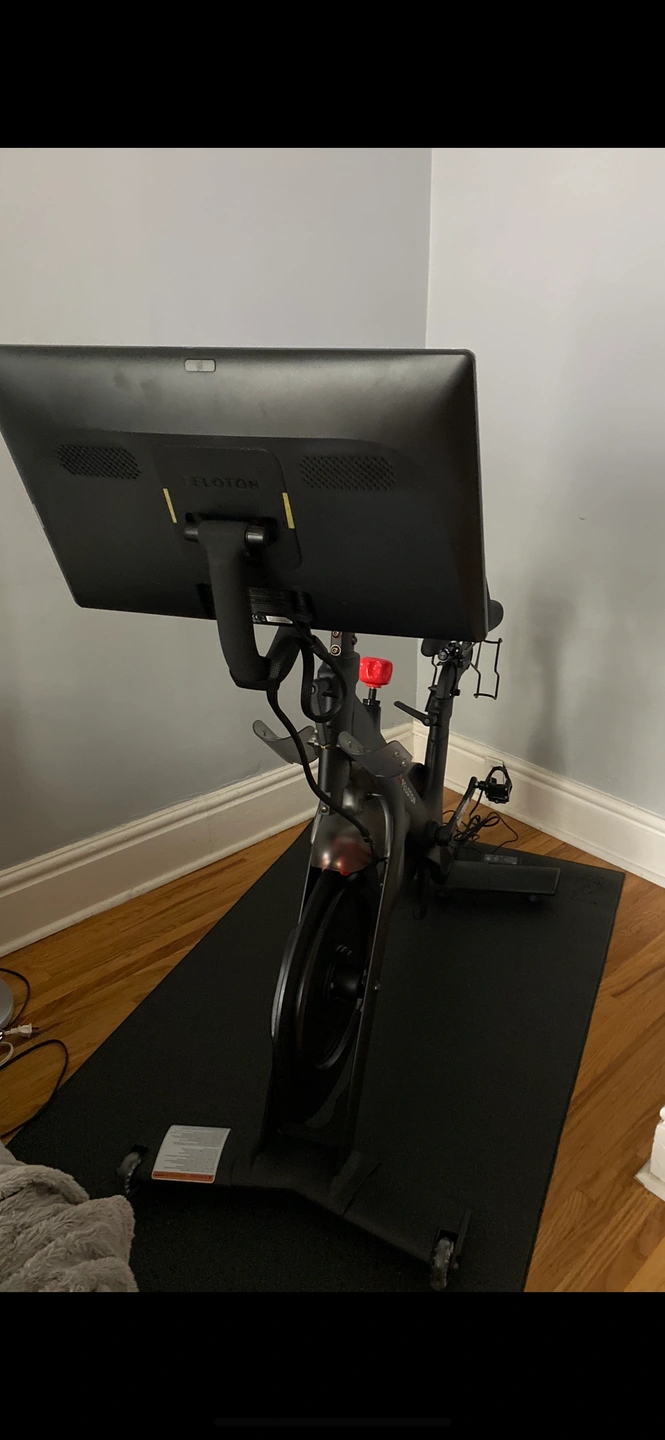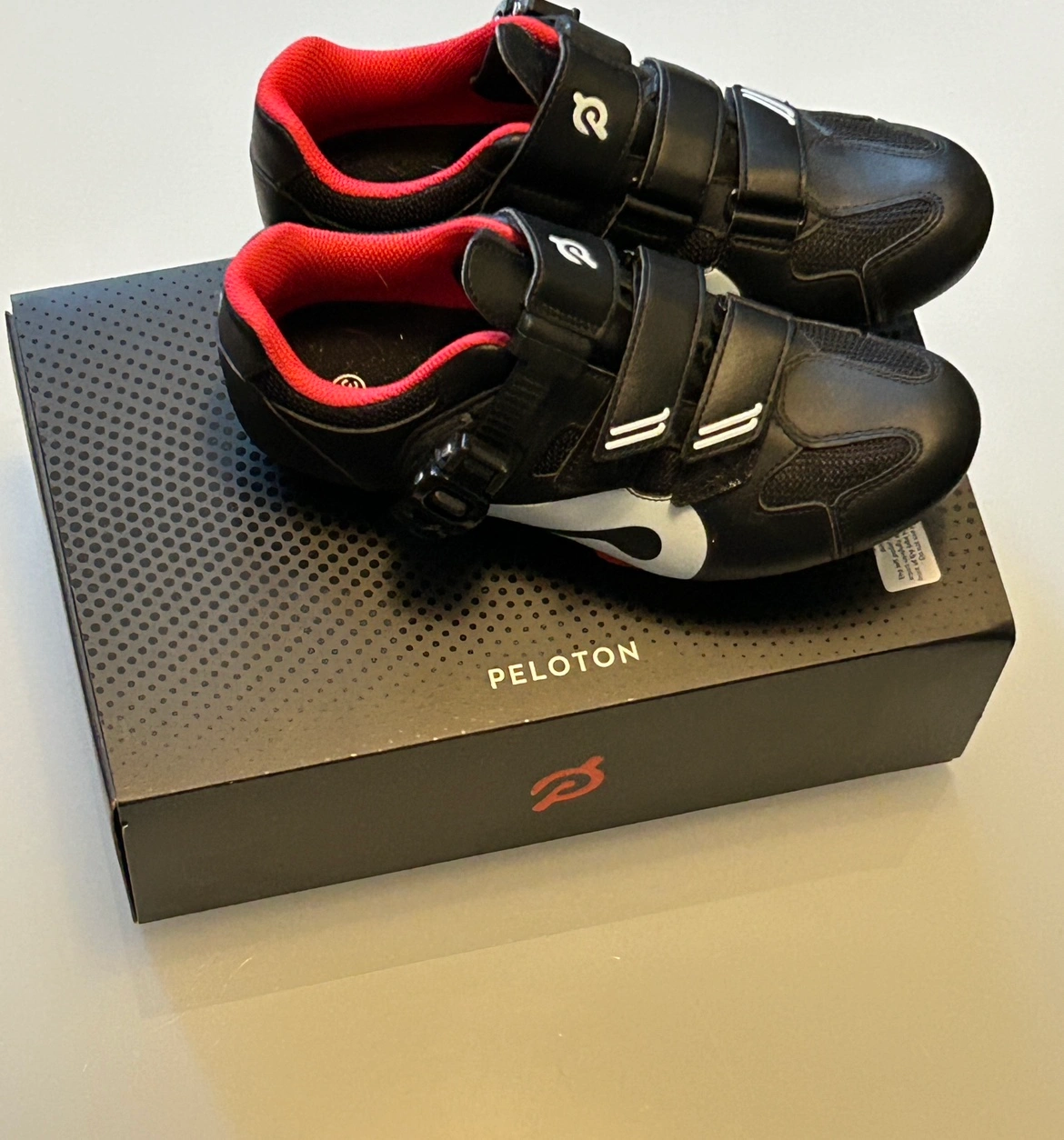 Includes Peloton Mat and Peloton Women’s 38 (size 7) clip in shoes and Men’s 45 and the toe cage for the pedals in case you don’t want to use clip in shoes. Everything you need is here.