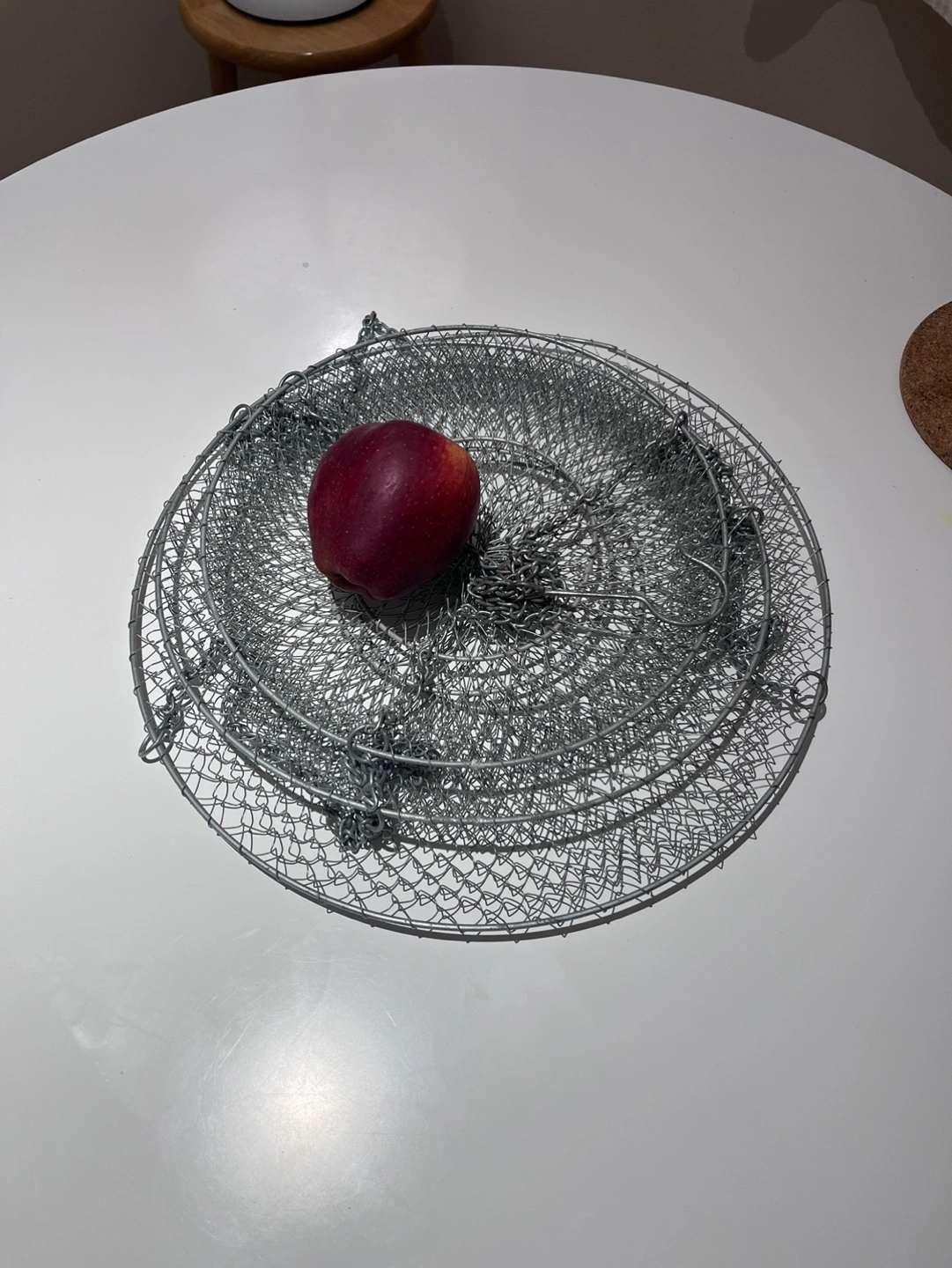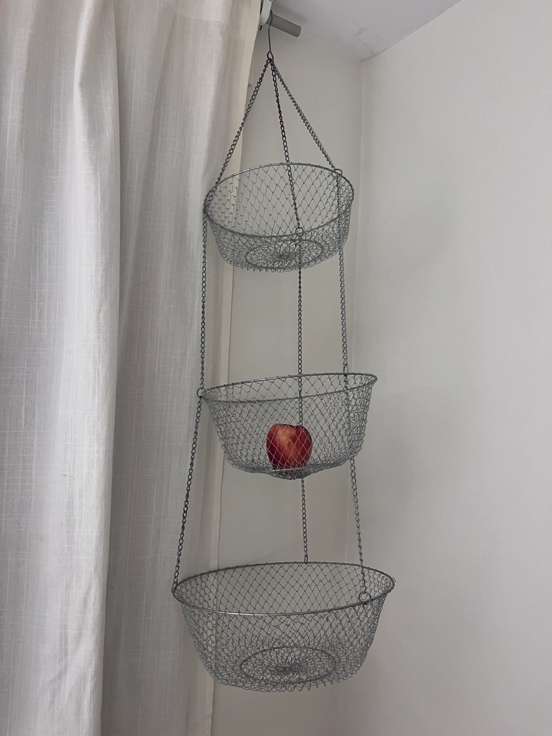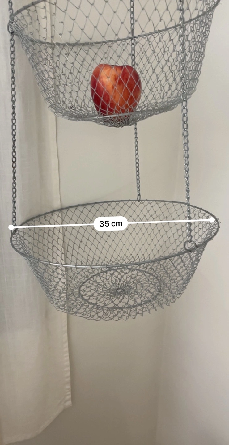 Set of three wire hanging baskets. Great for fruit or vegetables. Measures 35 cm across large bottom one.