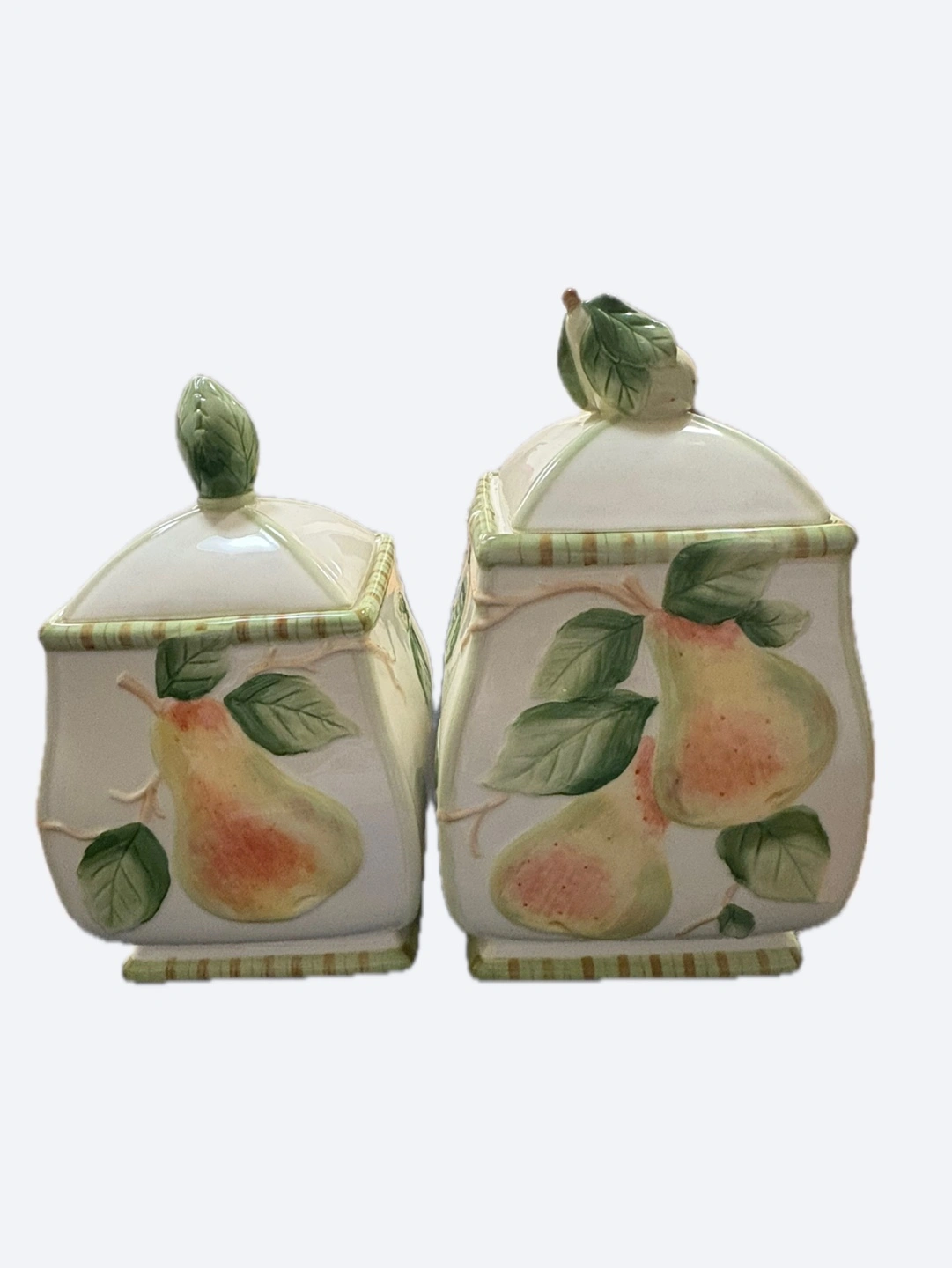 1000+Set of 2 ceramic canisters with pear design and lids. 9.5 inch canister $10 10.5 inch canister $12 $20 for the pair