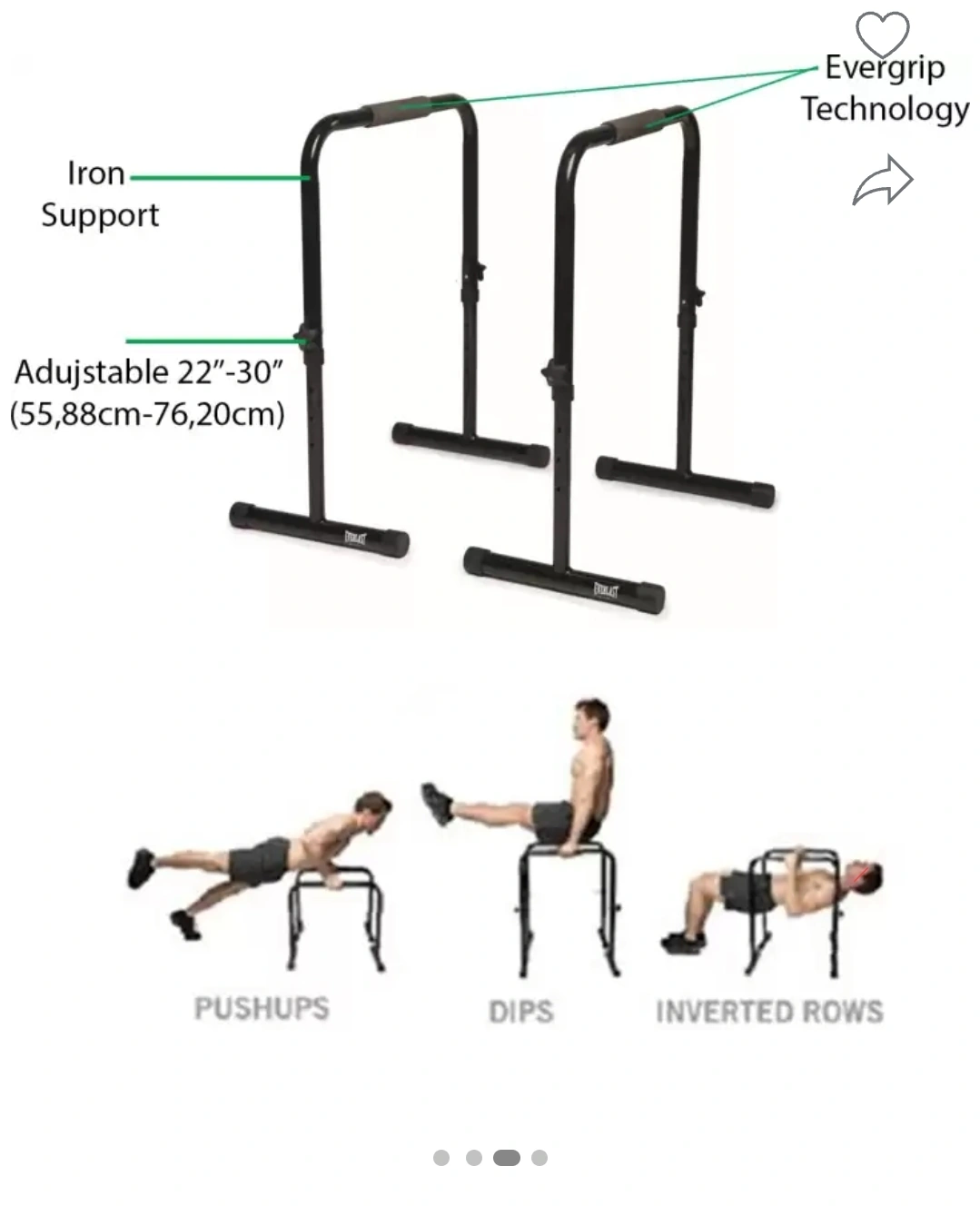 *Adjustable dip bars for dips, pushups, and inverted rows. Height adjustable. Features Evergrip Technology.