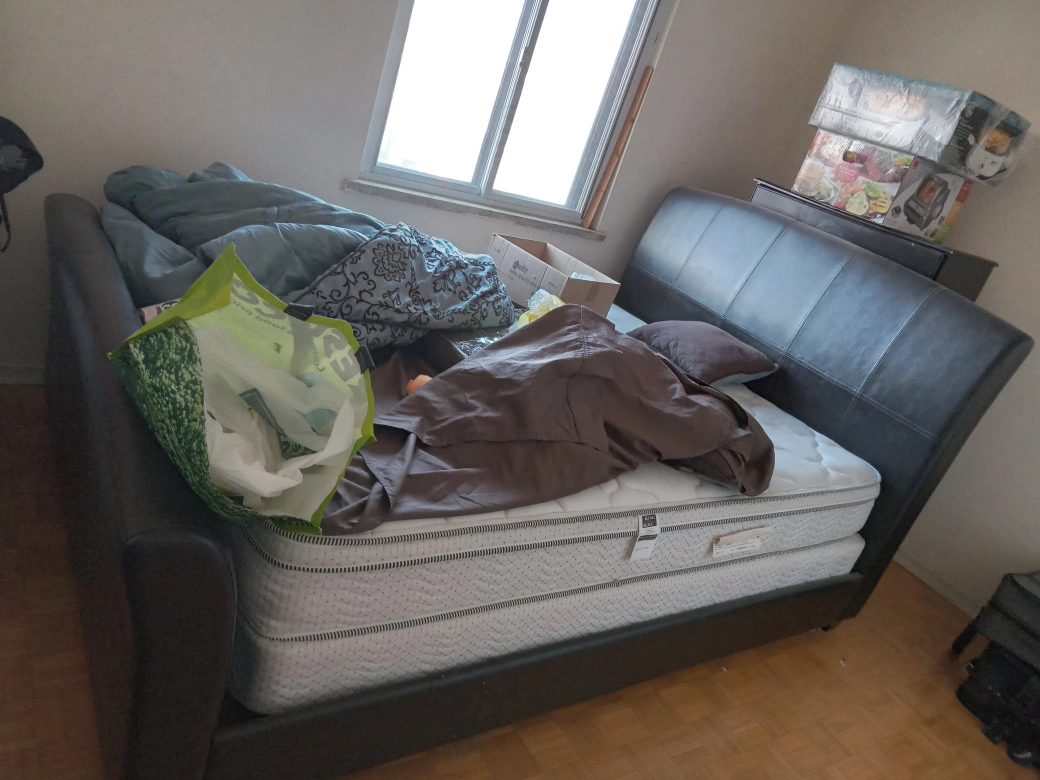 74guc queen size bed frame with headboard and footboard Faux leather upholstery. asking $200 firm $50 extra for boxspring kept in spare bedroom barely ever used pick up is in brampton