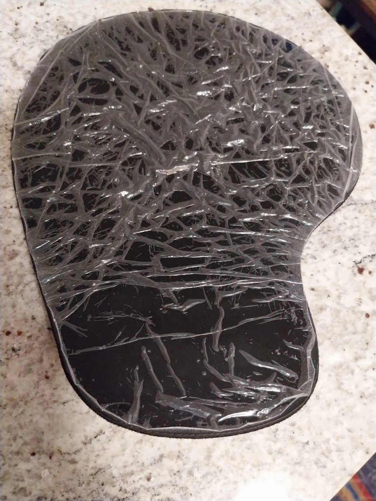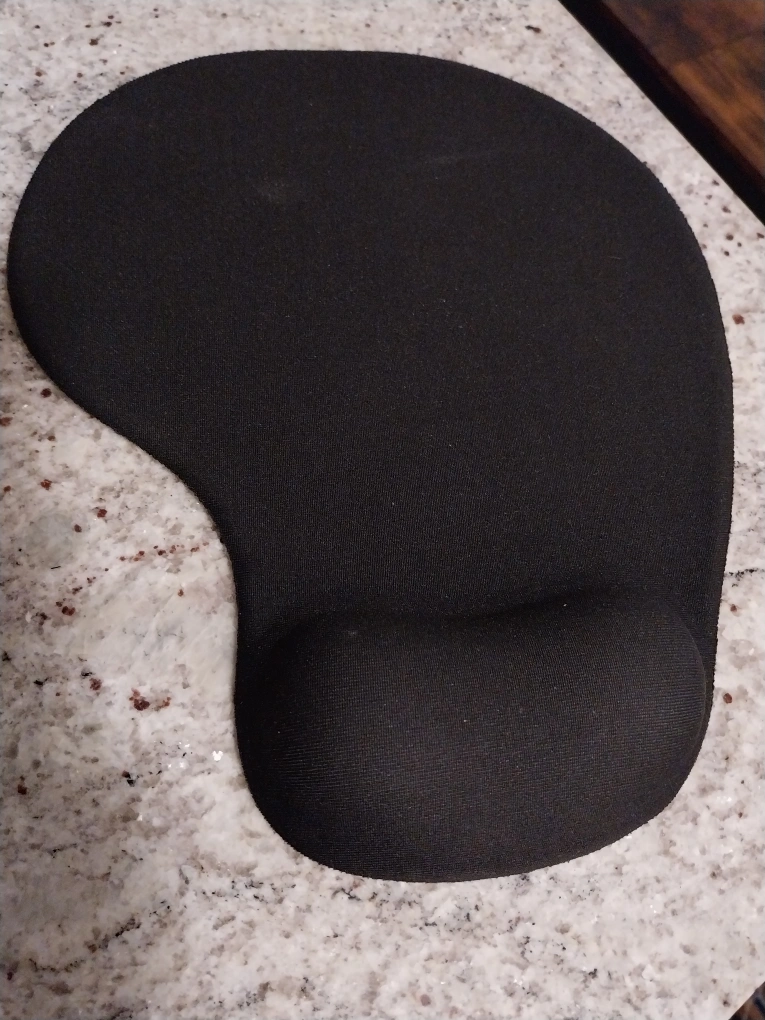 Black ergonomically designed mouse pad with wrist support/rest. Has adhesive backing. Unused.