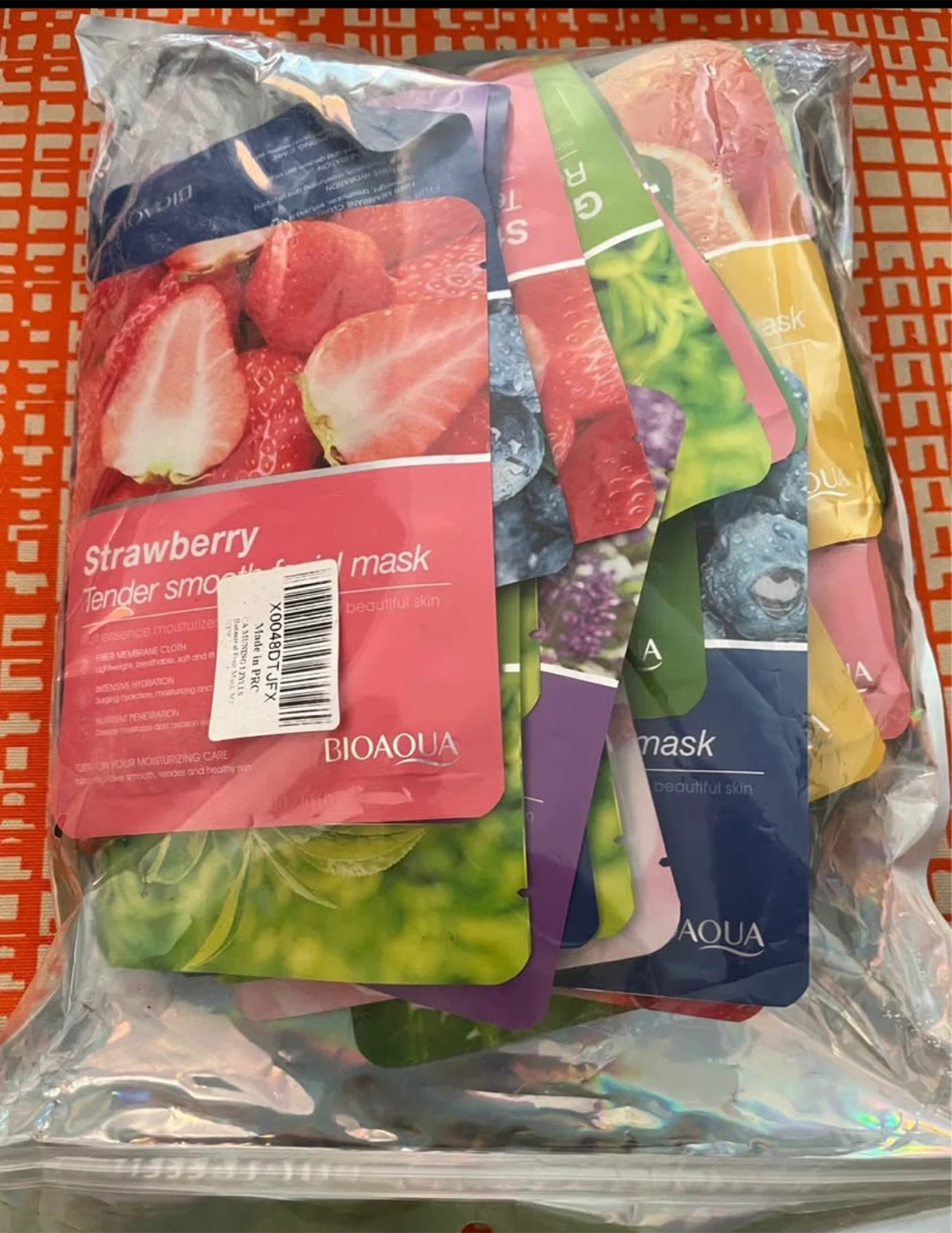 A set of BIOAQUA tender smooth facial masks with various fruit essences. These masks are made with fiber membrane cloth for intensive hydration. They're designed to make skin smooth, tender, and healthy.