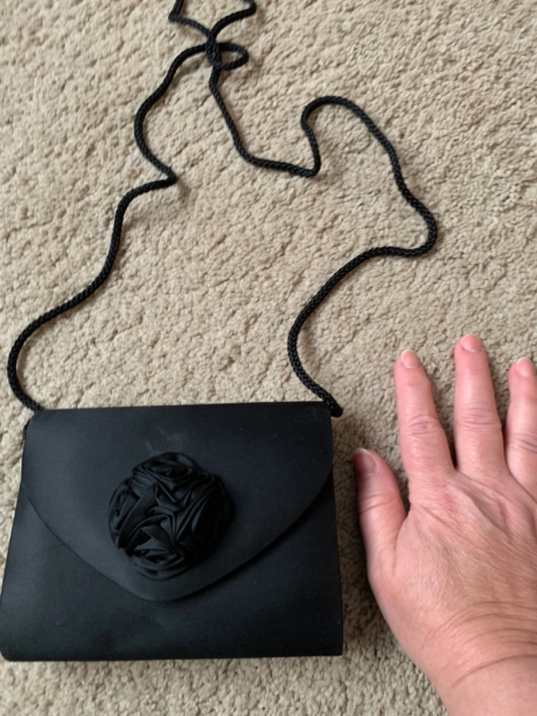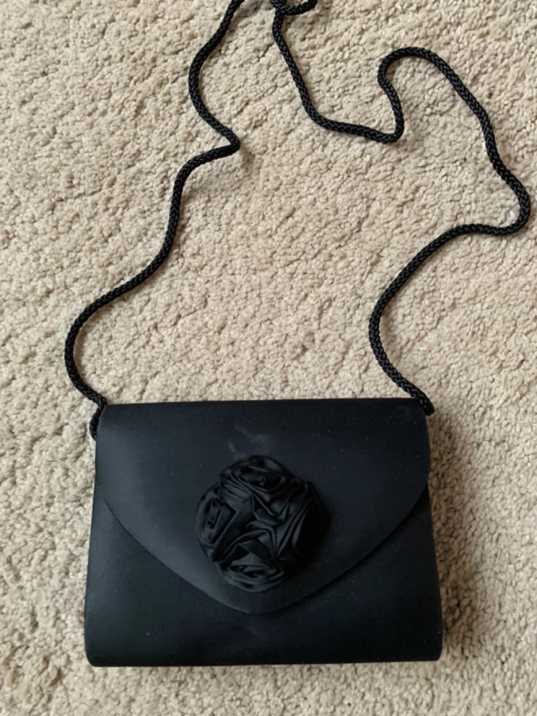 Elegant Black satin evening bag with a rose embellishment and a long strap. Small in size - can be used as a clutch