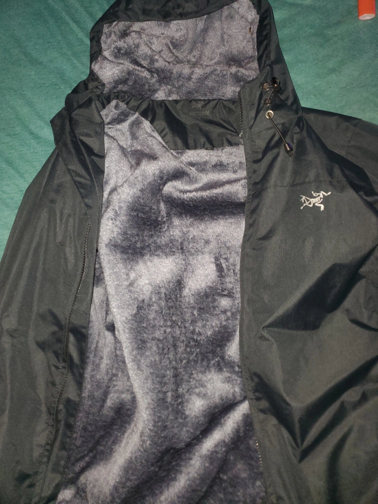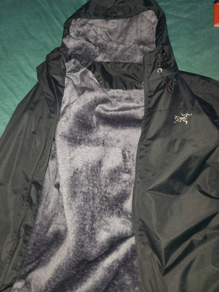 67Men's jacket with a hood and zipper closure. It has several pockets. fur inside color is black 85$