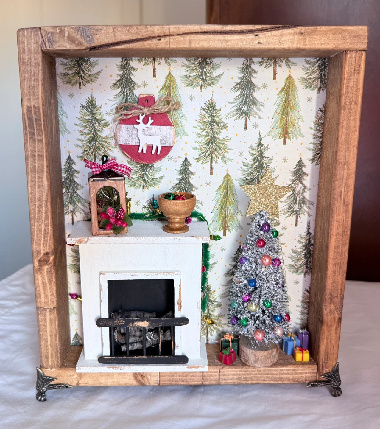 Beautiful and unique handmade Christmas decoration made by my mom. Shadow box made with real wood, sits in sturdy metal legs. Comes with all the decorations seen in the pictures. Perfect addition to your living room & bedroom decor. Christmas tree batteries can be replaced. Measures 25 cm wide x 26 cm tall x 3.7 cm deep.