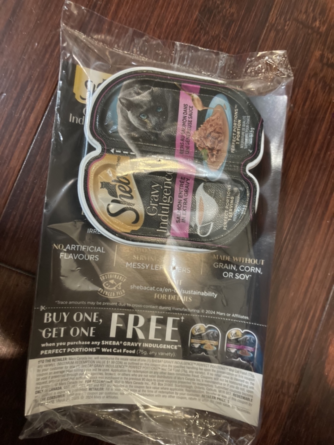 Buy one get one free coupon for Sheba Gravy Indulgence cat food. Perfect portions, salmon entree in extra gravy.