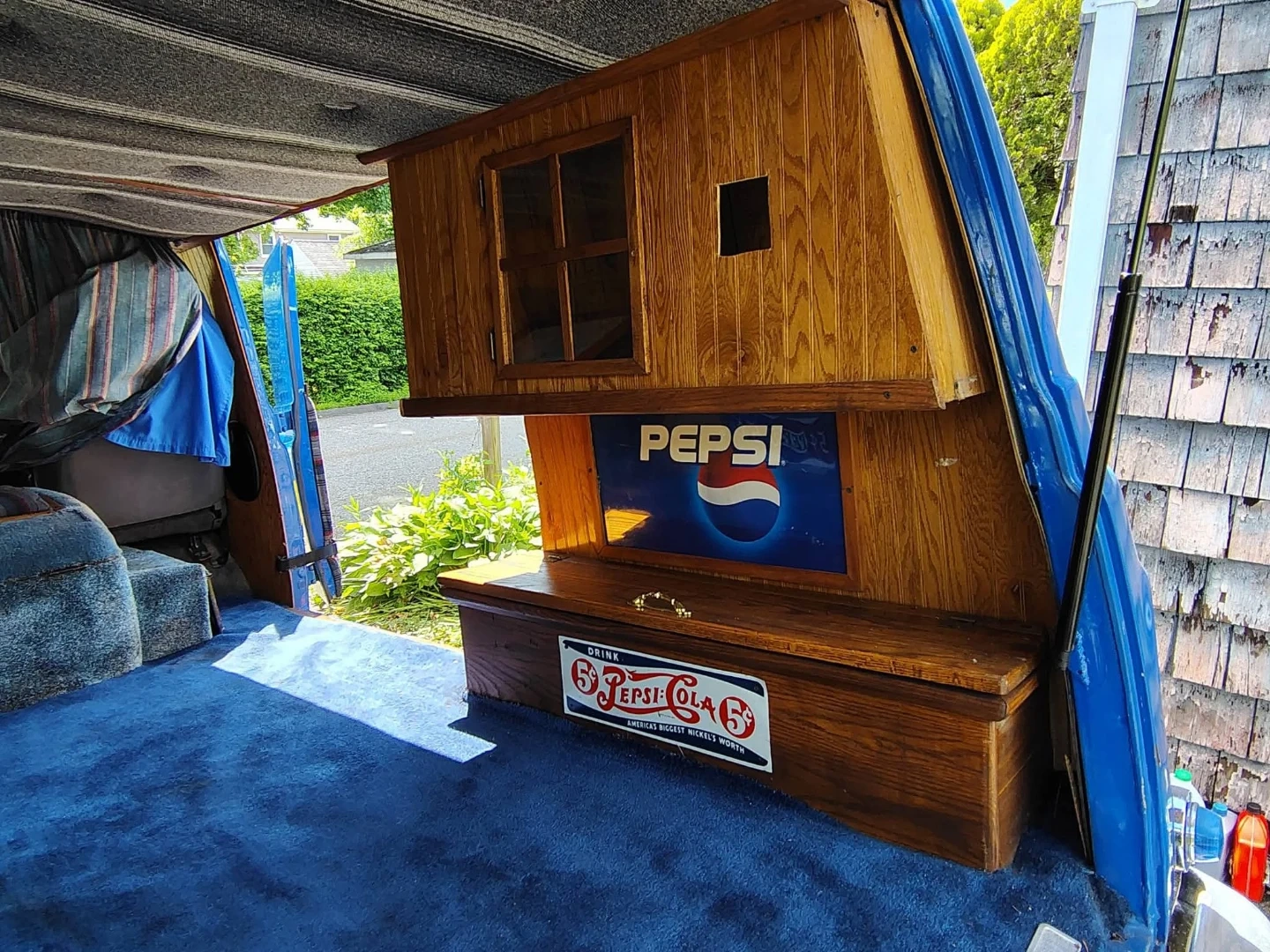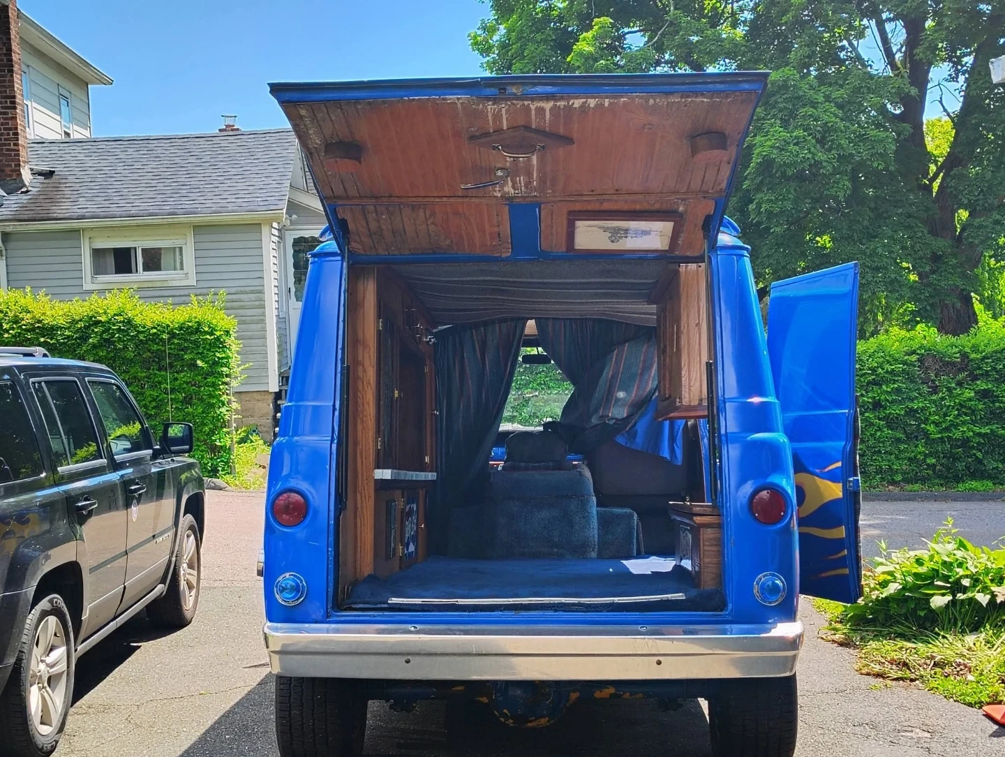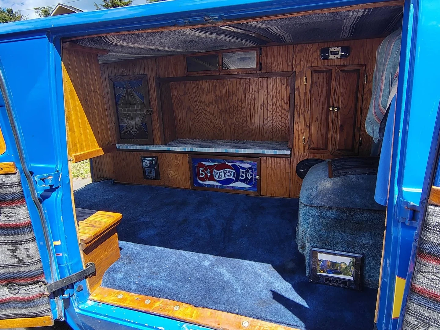 Selling a blue Ford Econoline custom van. It has custom interior and exterior paint. The van has custom wheels and tires. Motor 400M