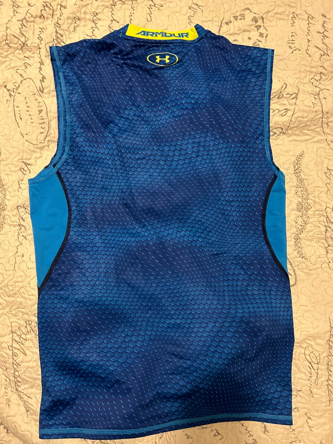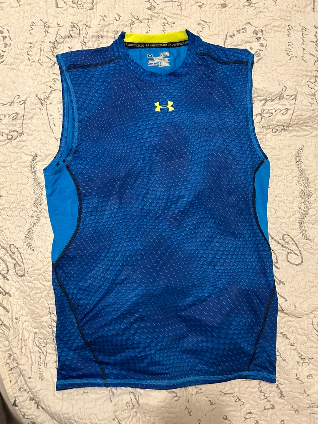 As compression shirt size XL. However first great to size M and L as a workout shirt. Sleeveless compression shirt. Blue with a snakeskin pattern and yellow accents.