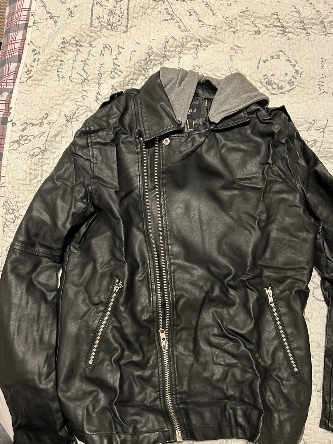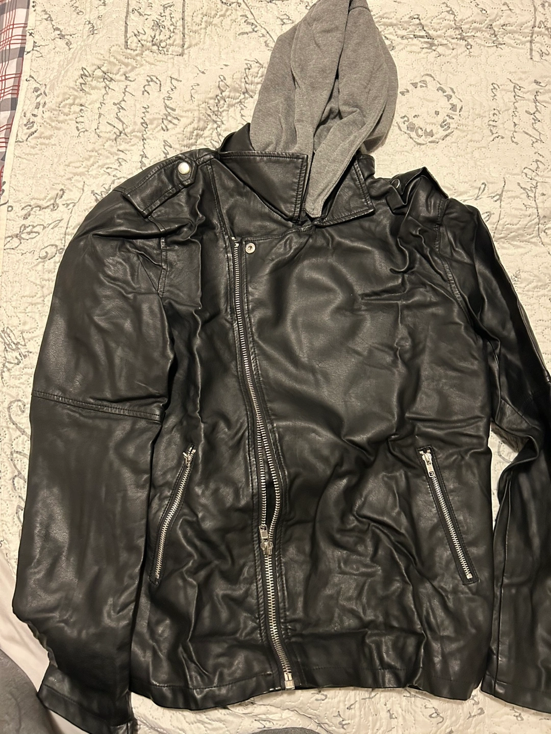 Black leather jacket with a grey hooded liner. Has a zipper closure and multiple pockets. Removable hood.