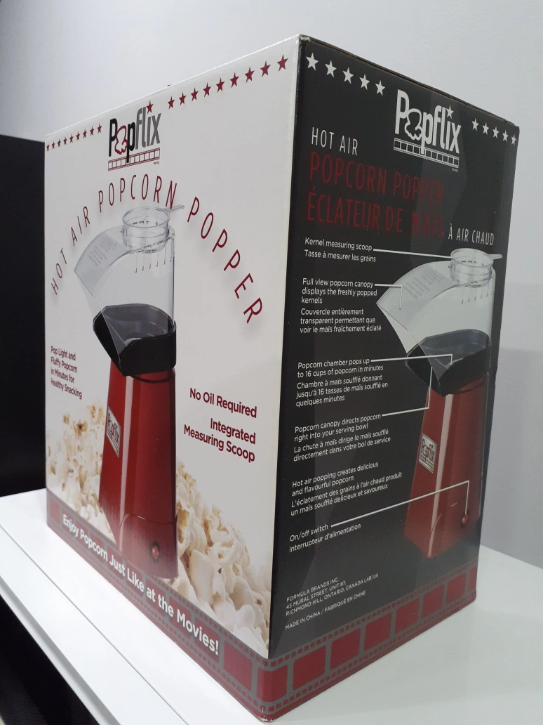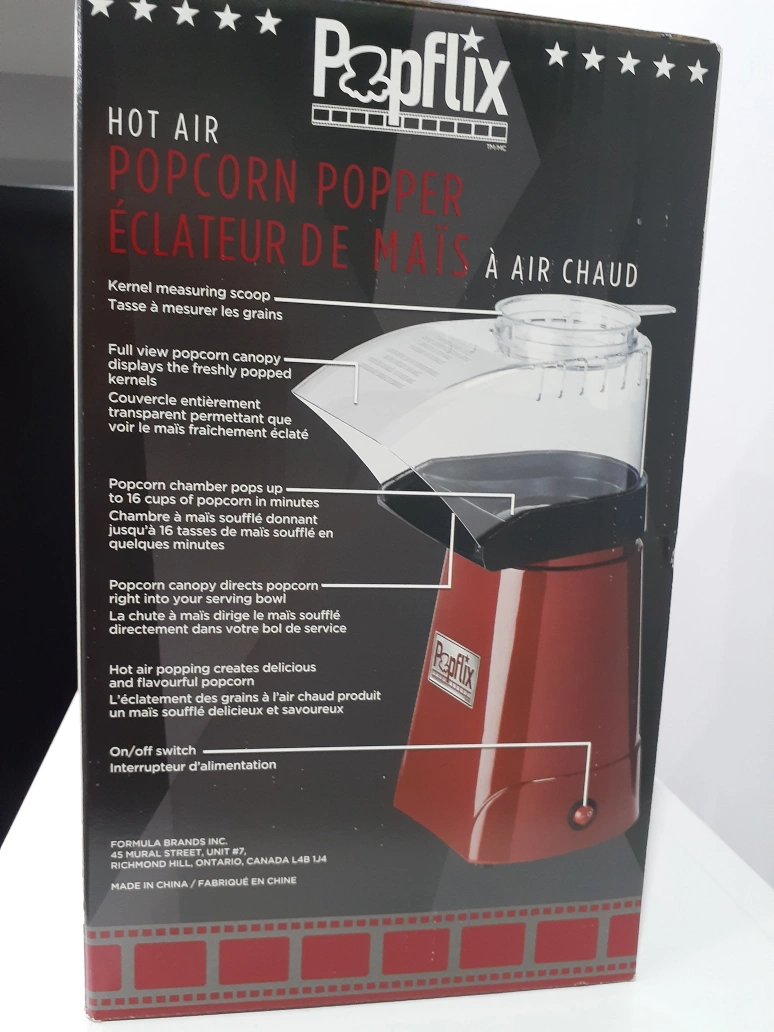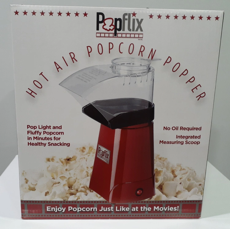 Red hot air popcorn popper. No oil required. Integrated measuring scoop. Enjoy popcorn just like at the movies!