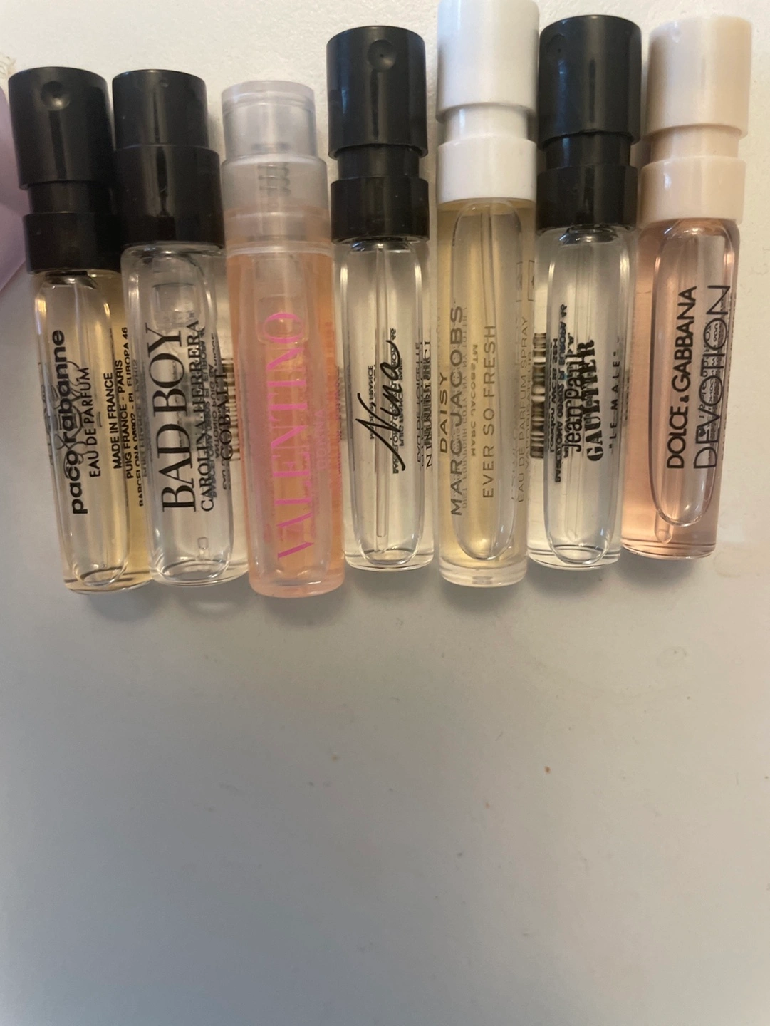 Set of perfume samples, includes several popular brands and scents. Paco Rabanne, Carolina Herrera, Valentino, Nina Ricci, Marc Jacobs, Jean Paul Gaultier, Dolce & Gabbana