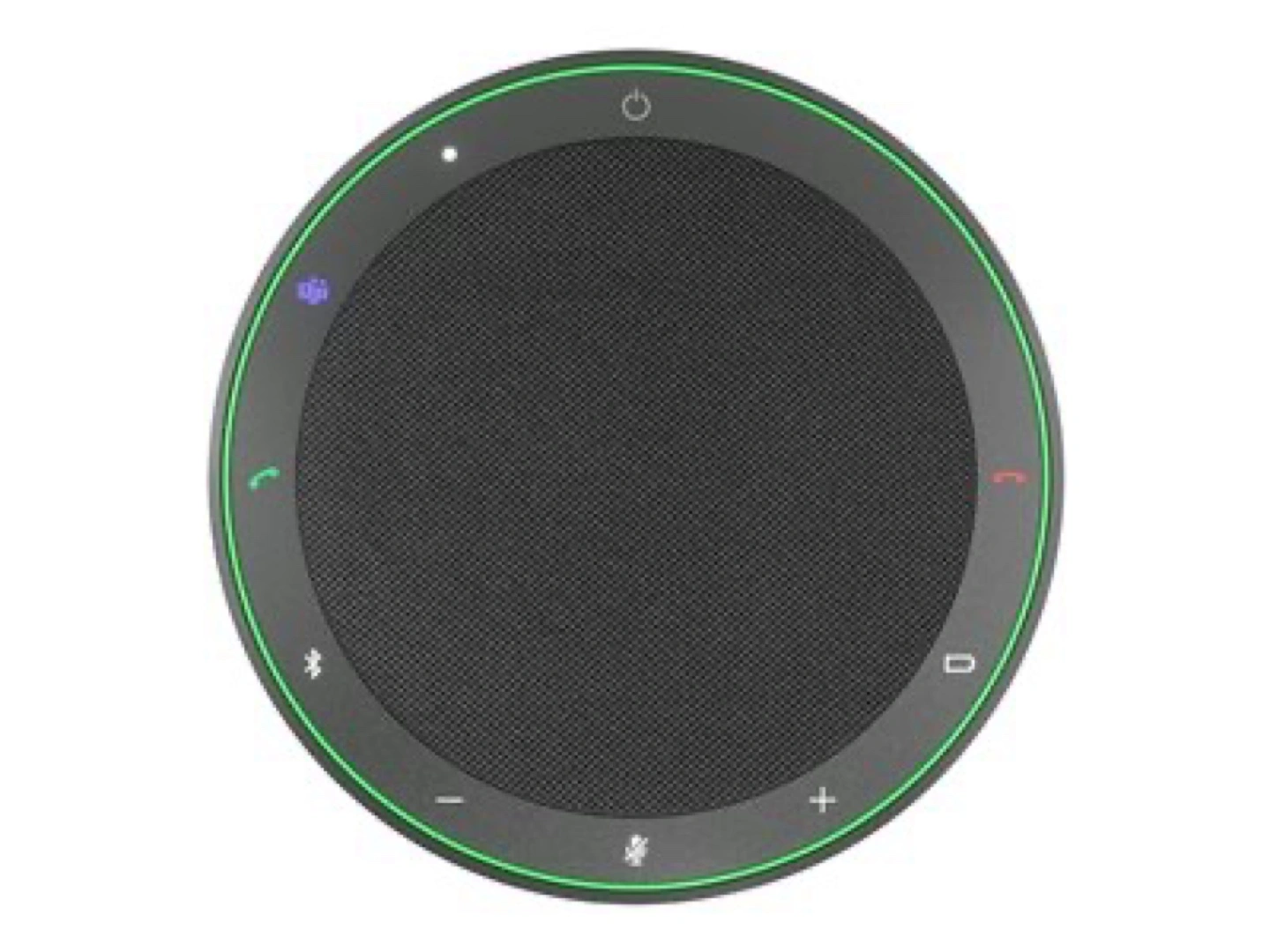 The rim of this disc-shaped speakerphone includes volume, mute, call, and power controls. There is also a programmable smart button that can be configured to speed dial a number, activate a voice assistant, and more. The Microsoft Teams button allows you to bring your meeting to the foreground.