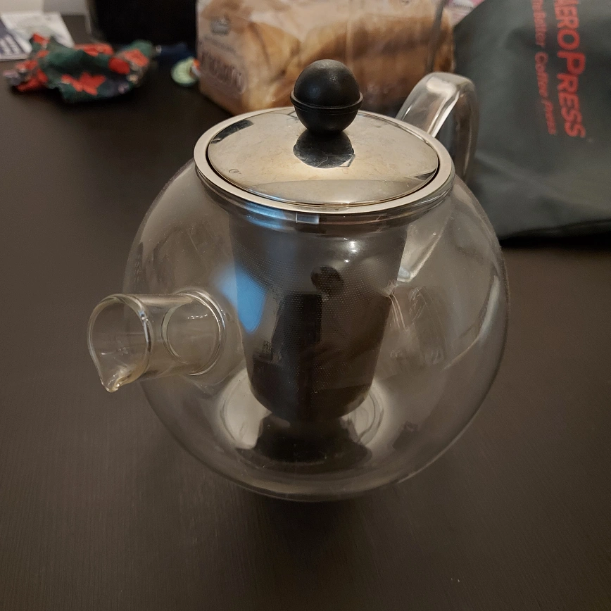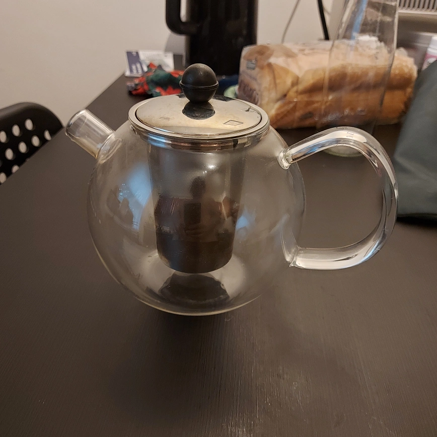 Used glass teapot with stainless steel lid and infuser. Still lots of life in it. Cash only, pick up at Pape station. I'm usually free during the week after 6pm.