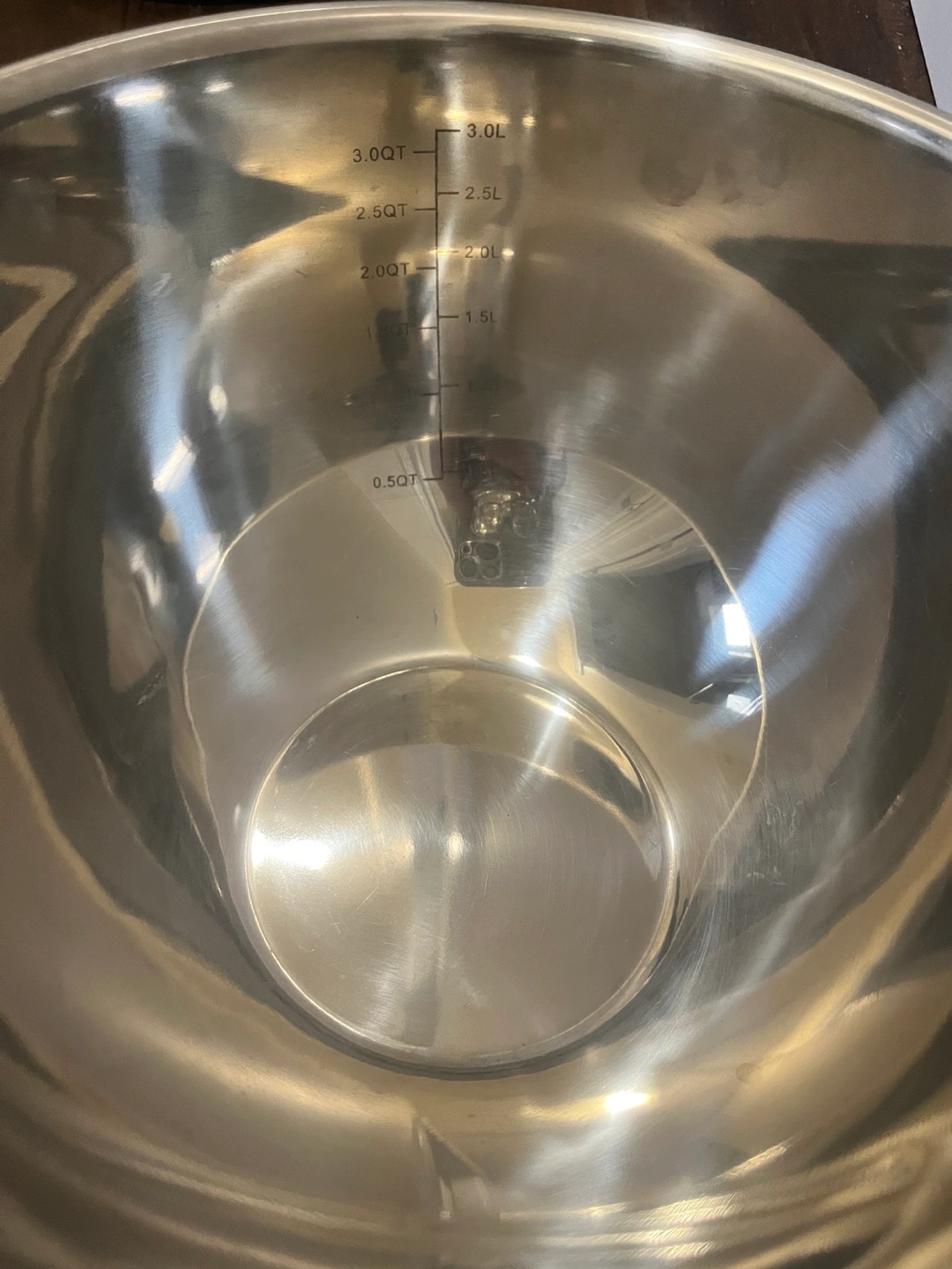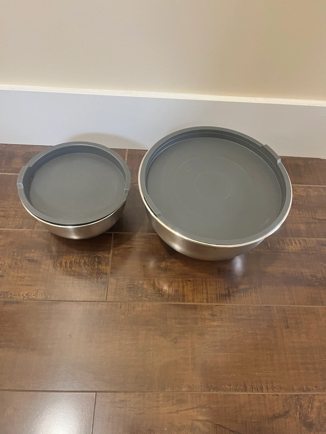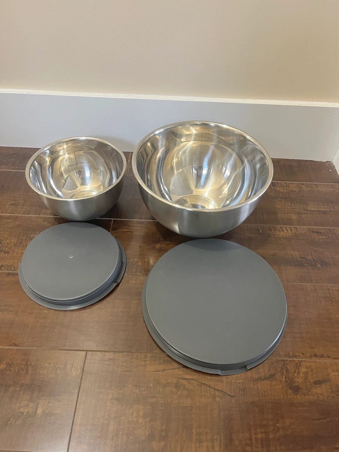 Set of 2 stainless steel mixing bowls with 2 lids. One is 1L and the other is 3L. Both have measurement markings on the inside. Brand: President Choice.
