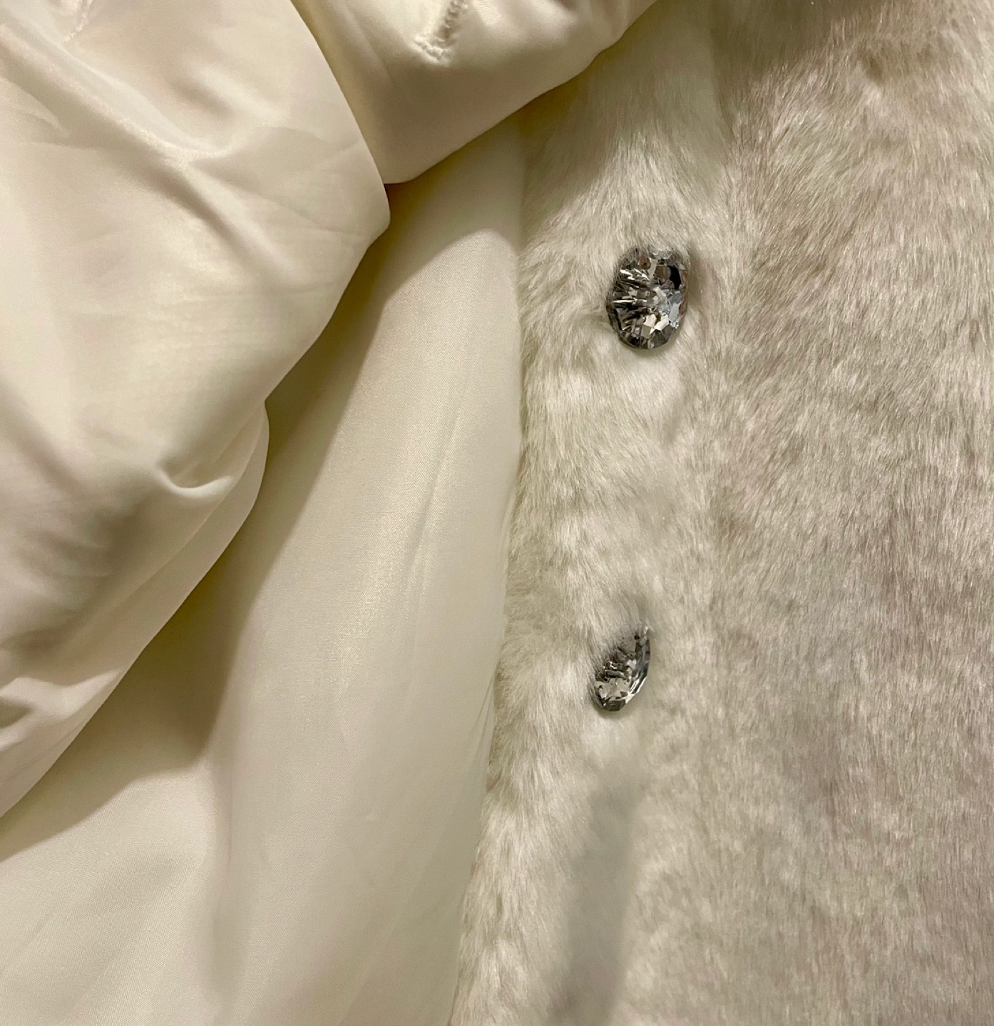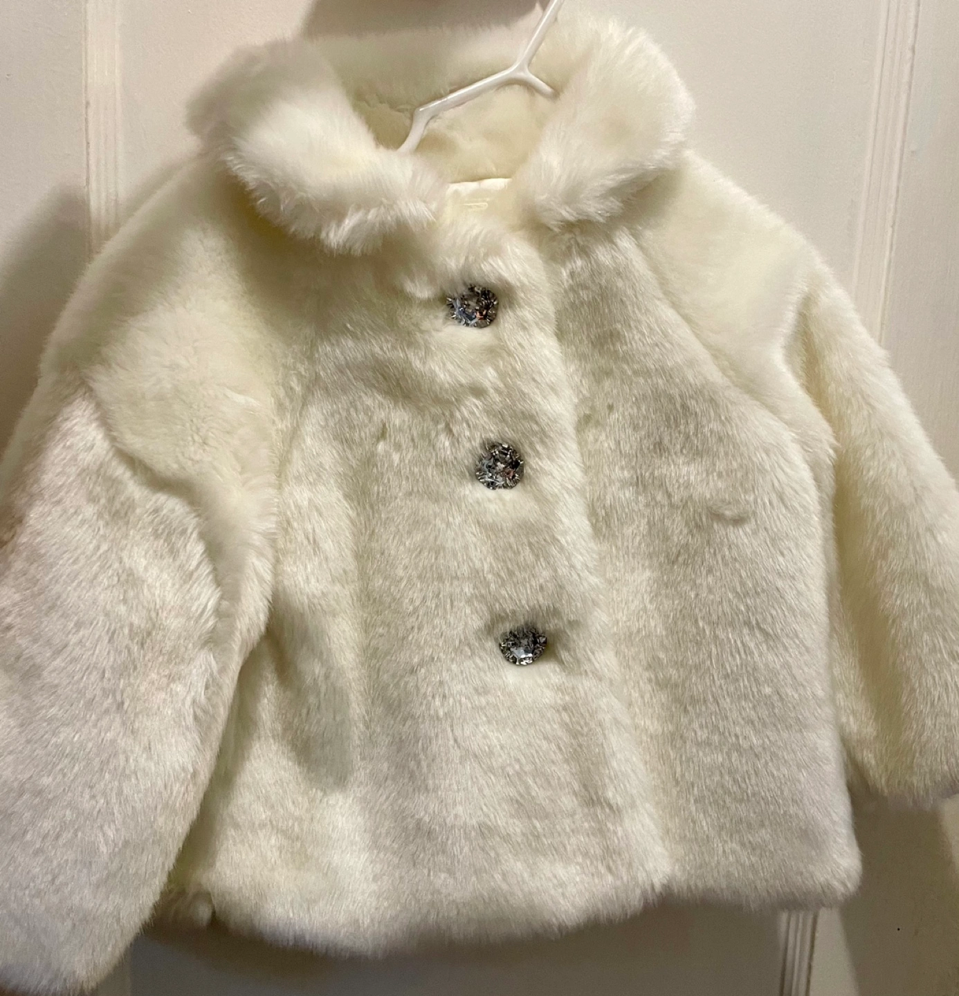 White faux fur coat with rhinestone buttons. Size 2T. Excellent condition, great from the holidays.