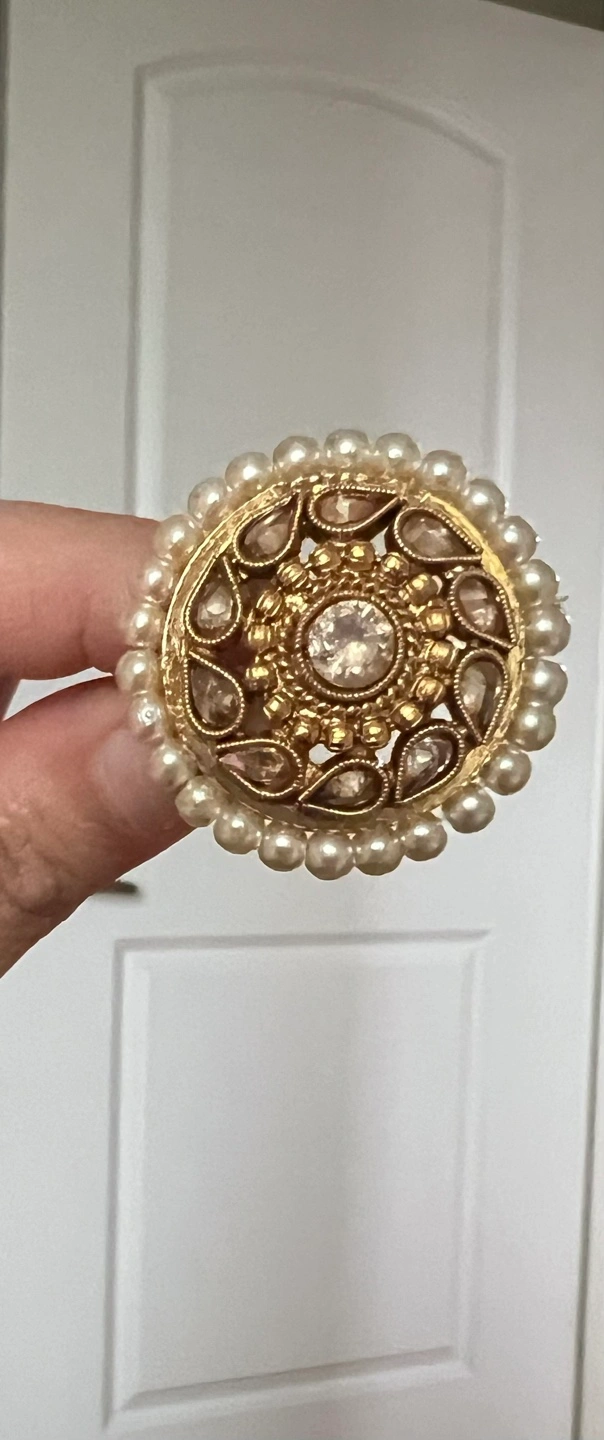 Gold ring with a large, round stone centre surrounded by smaller stones. Ring is decorated with pearl accents.