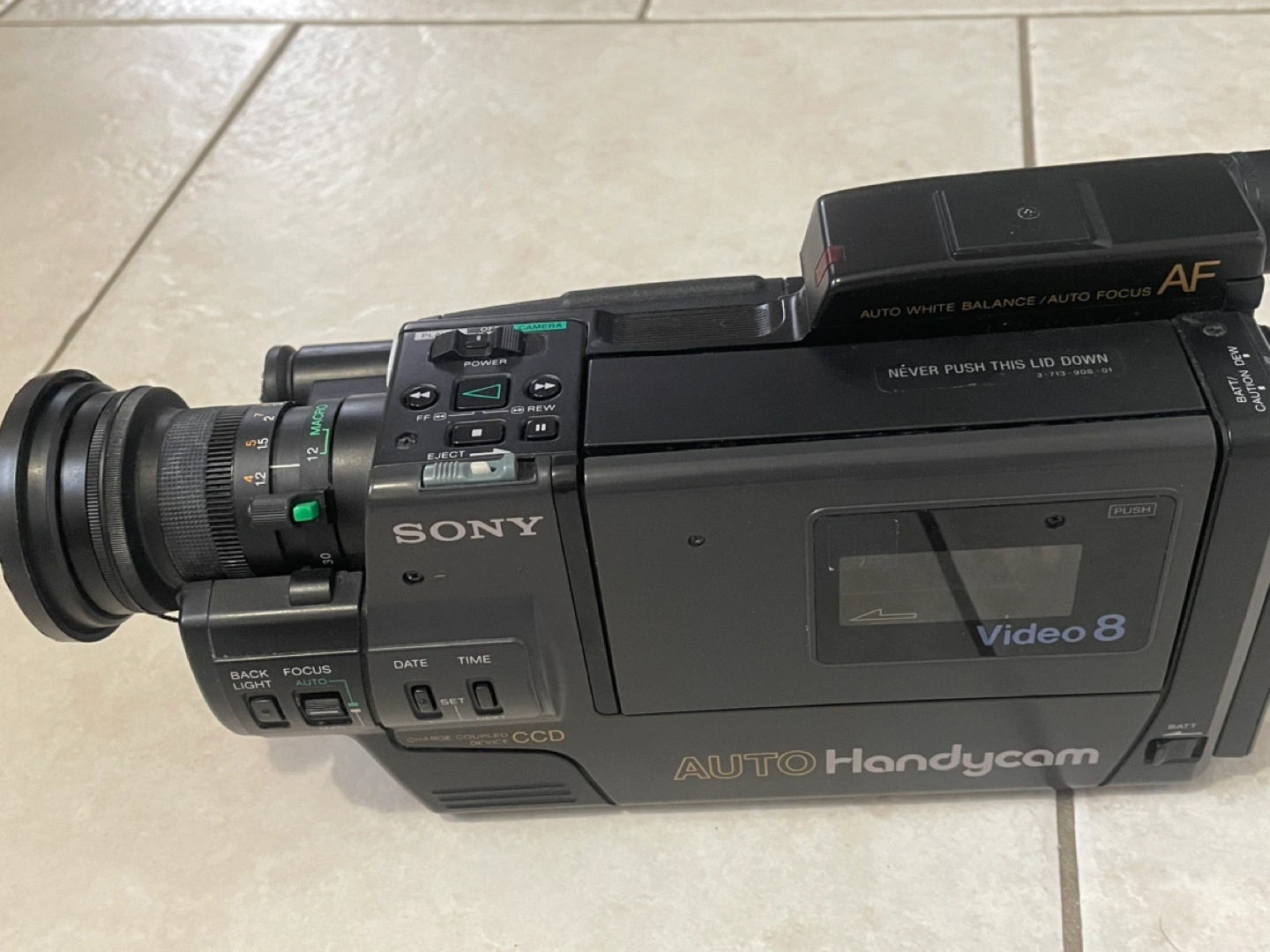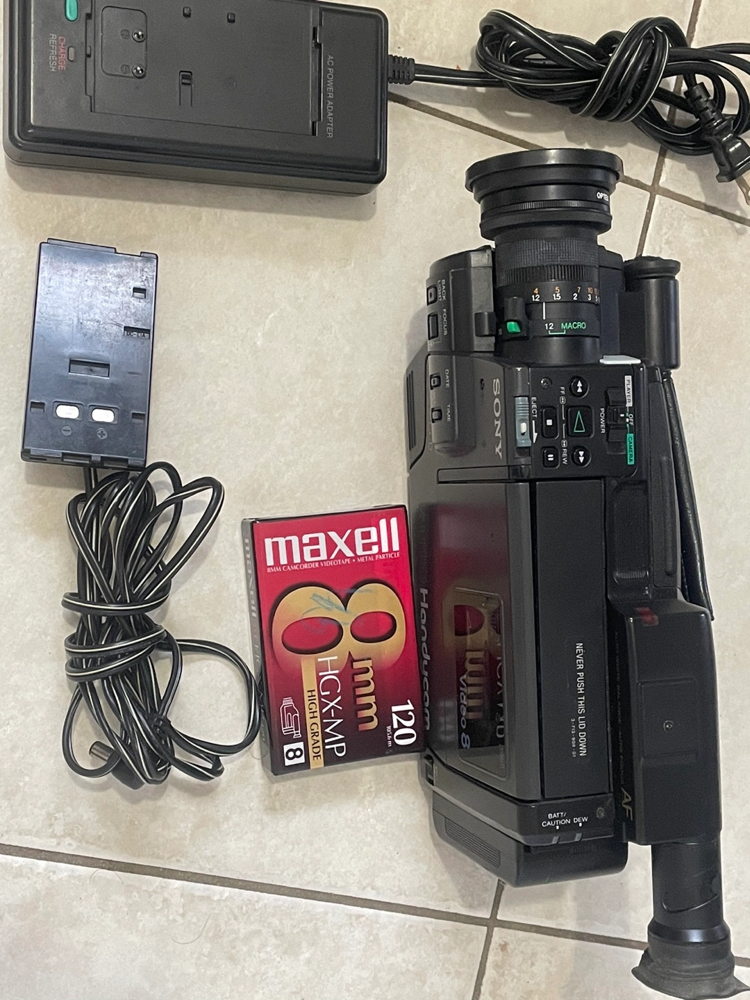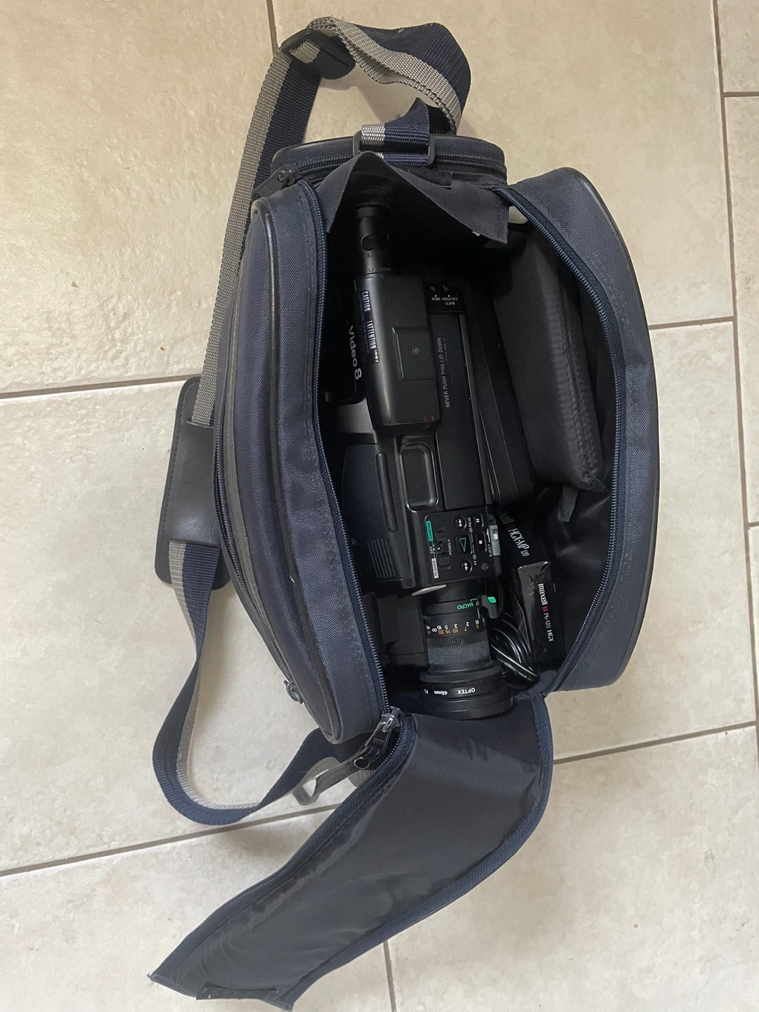 Video 8 camcorder with carrying case, power adapter, and a Maxell Hi8 video cassette.