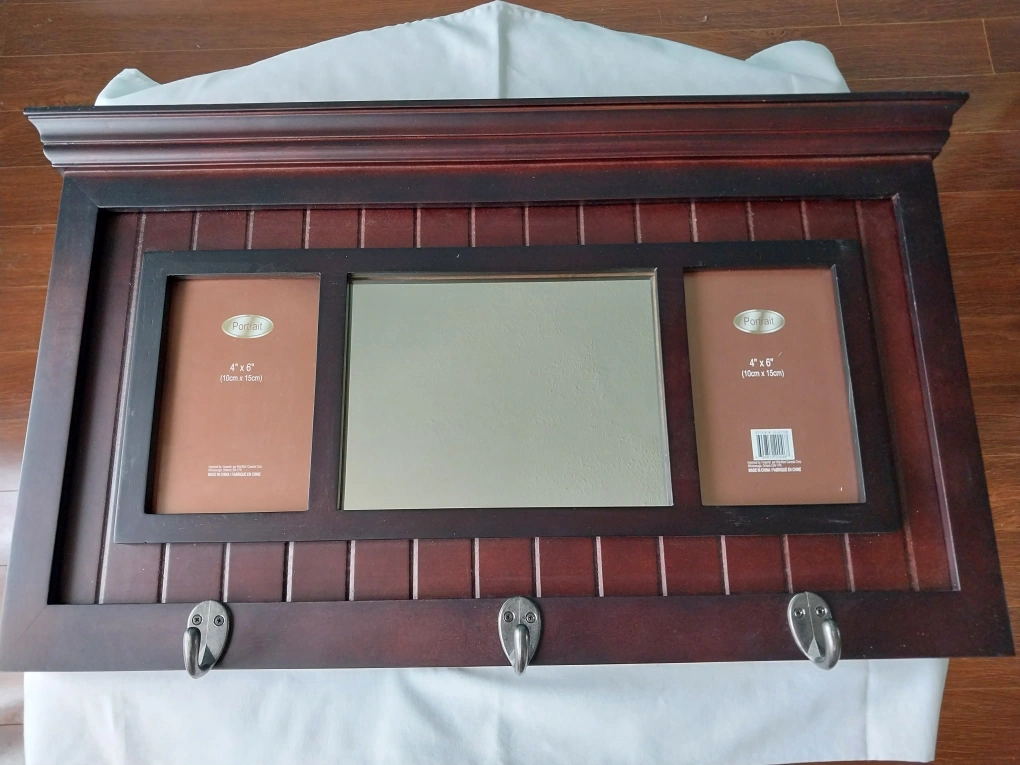 *Cash and pick up ONLY at location shown on ad. NO trades or delivery. ✅️Wooden wall mounted multi-purpose picture frame with mirror and hooks. Includes two 4" × 6" photo frames and a mirror. There are 2 recessed hooks hanging. Measures 23 1/2" wide × 13" tall ×1 3/4" deep.