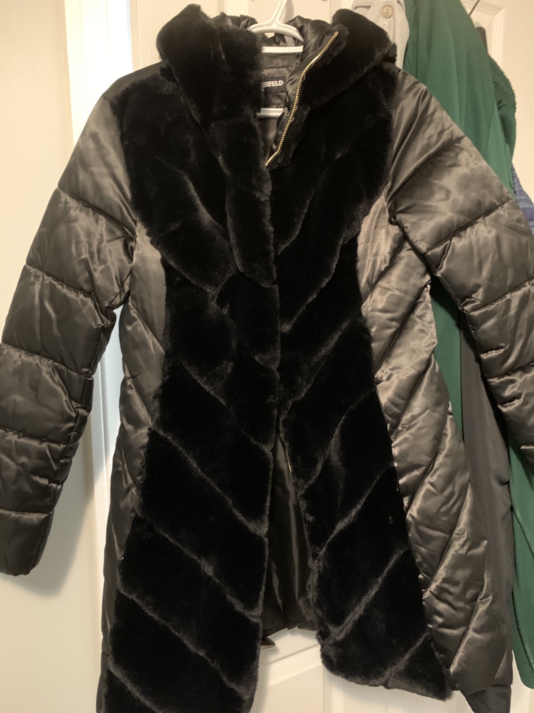 Black puffer jacket with faux fur details. Size medium for women