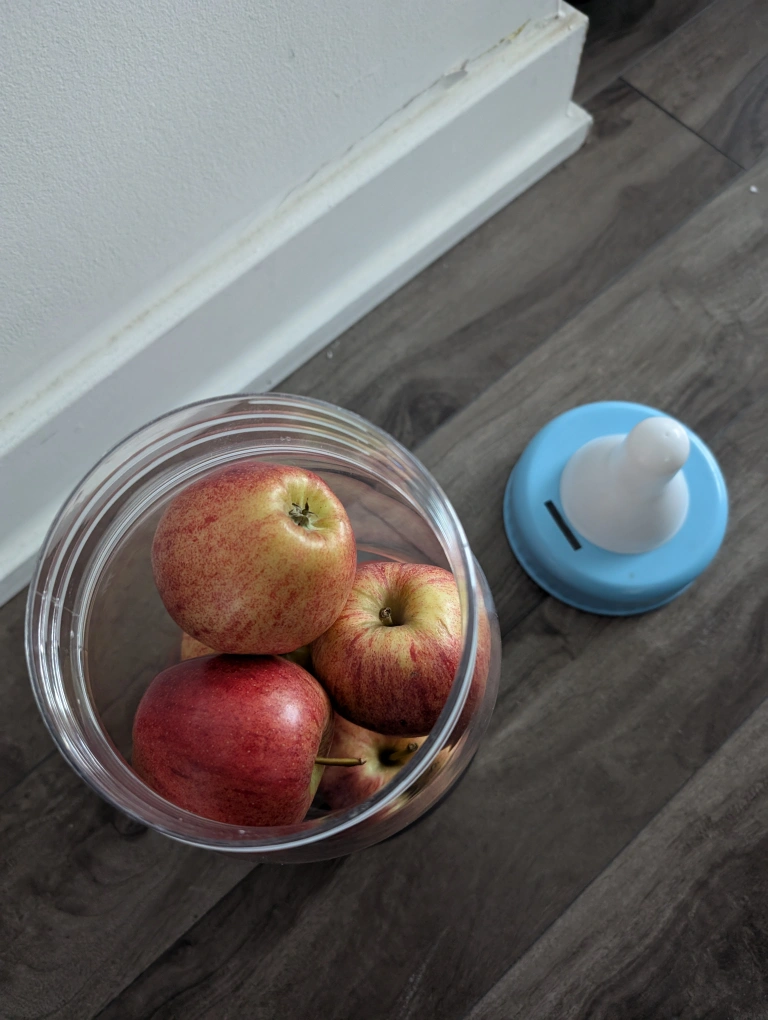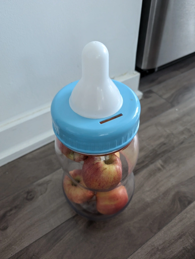 Large plastic baby 🍼 milk bottle coin bank/versatile container for candies, small toys or knickknacks. Blue lid . Clear plastic body. Has a slot to put coins in. Measures approximately 14 inches tall. Opening is about 4.5 inches wide.