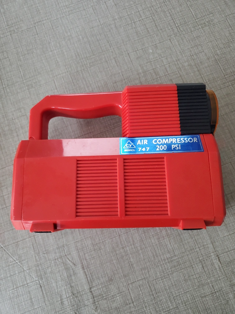344Red and black air compressor with a gauge, cord, hose and accessories. Model 747. 200 PSI.