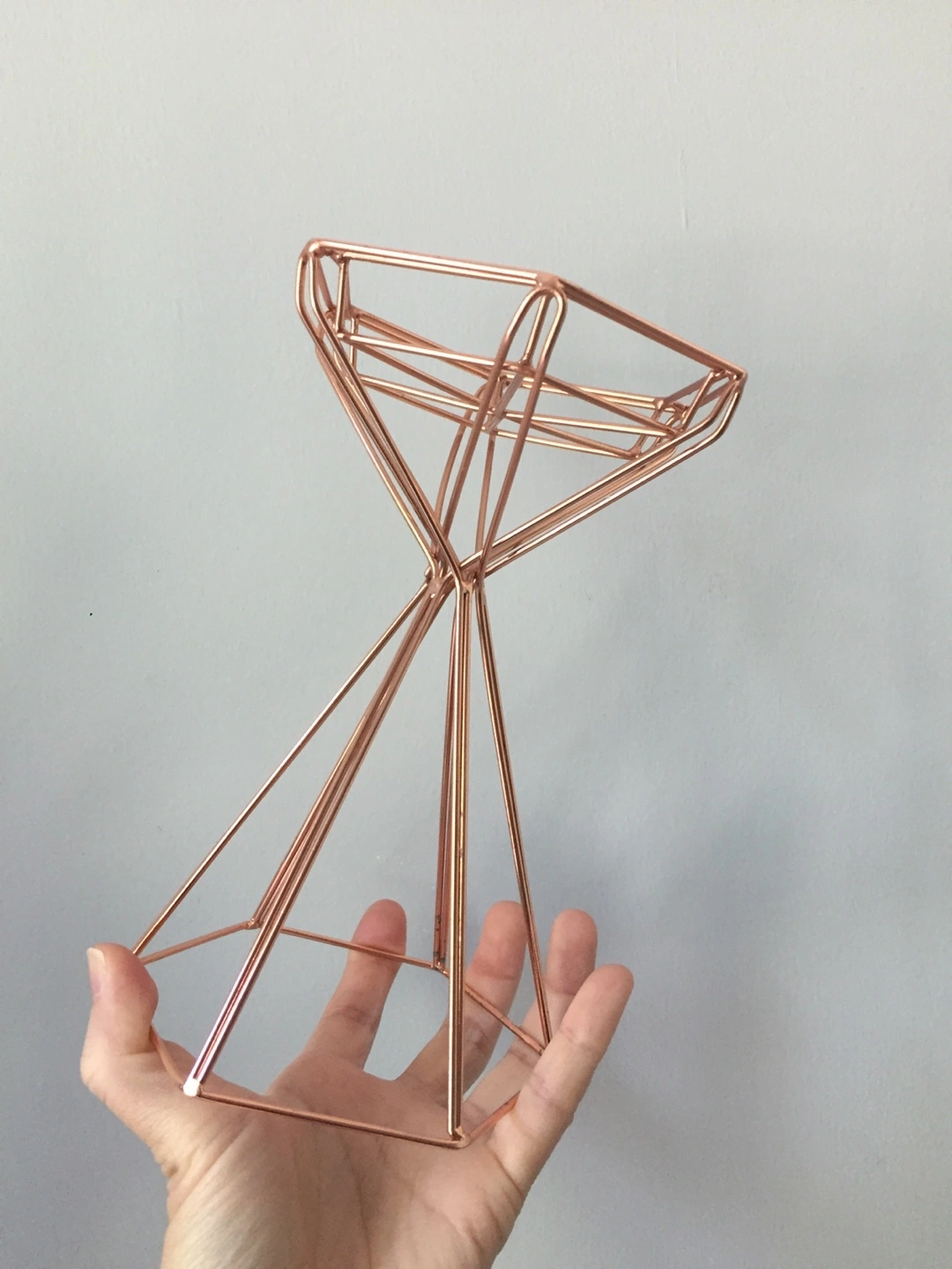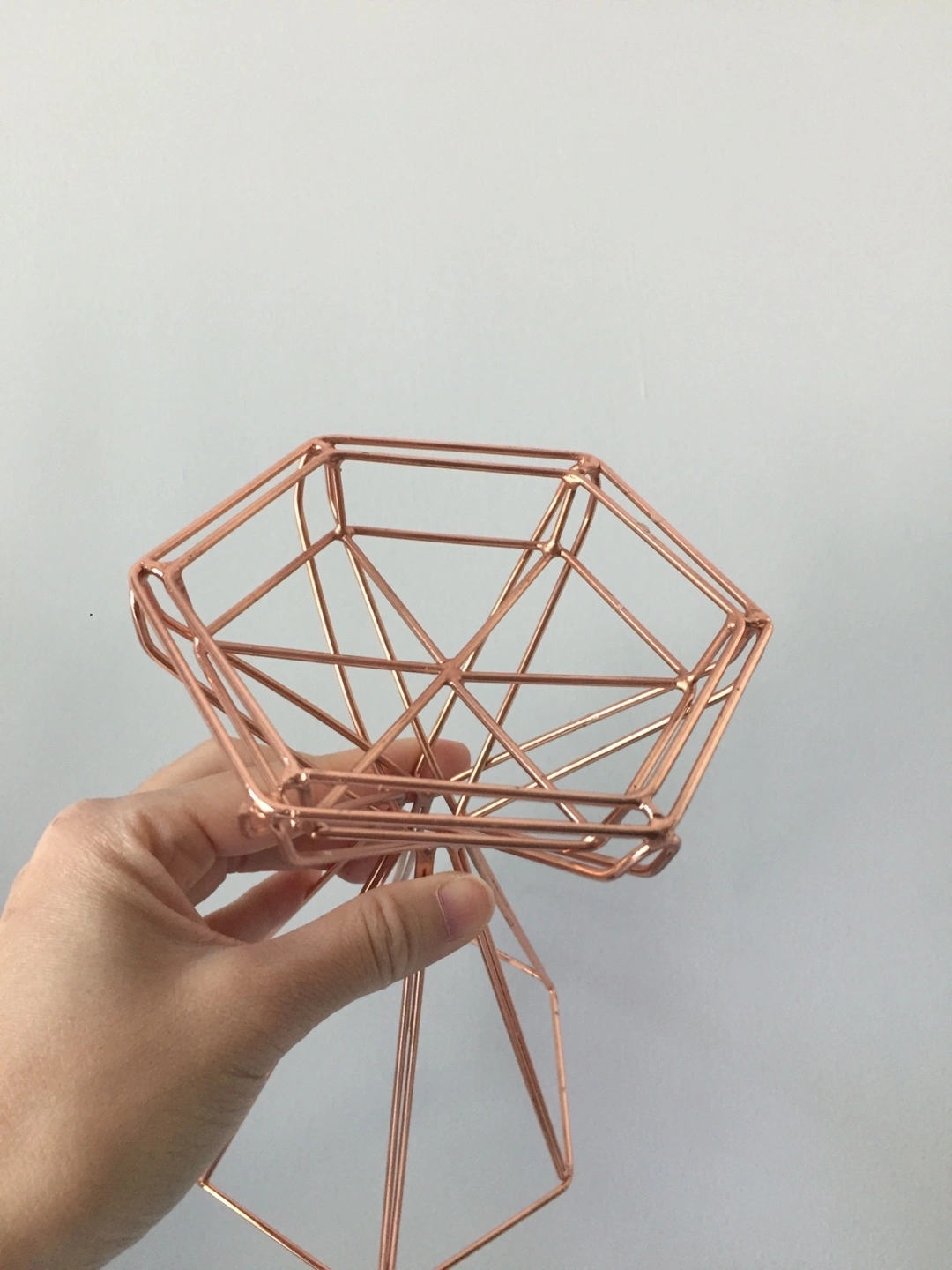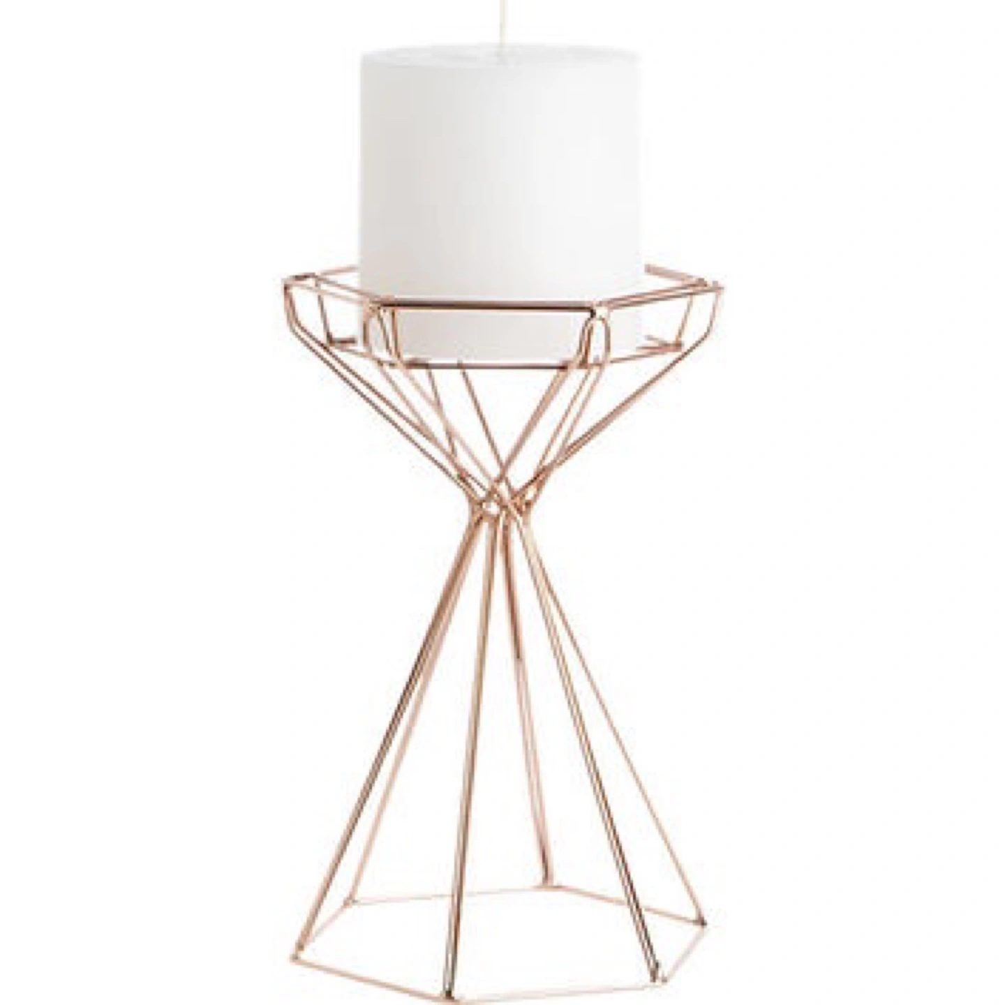 Rose gold metal candle holder. Geometric design. Perfect for a modern decor aesthetic.