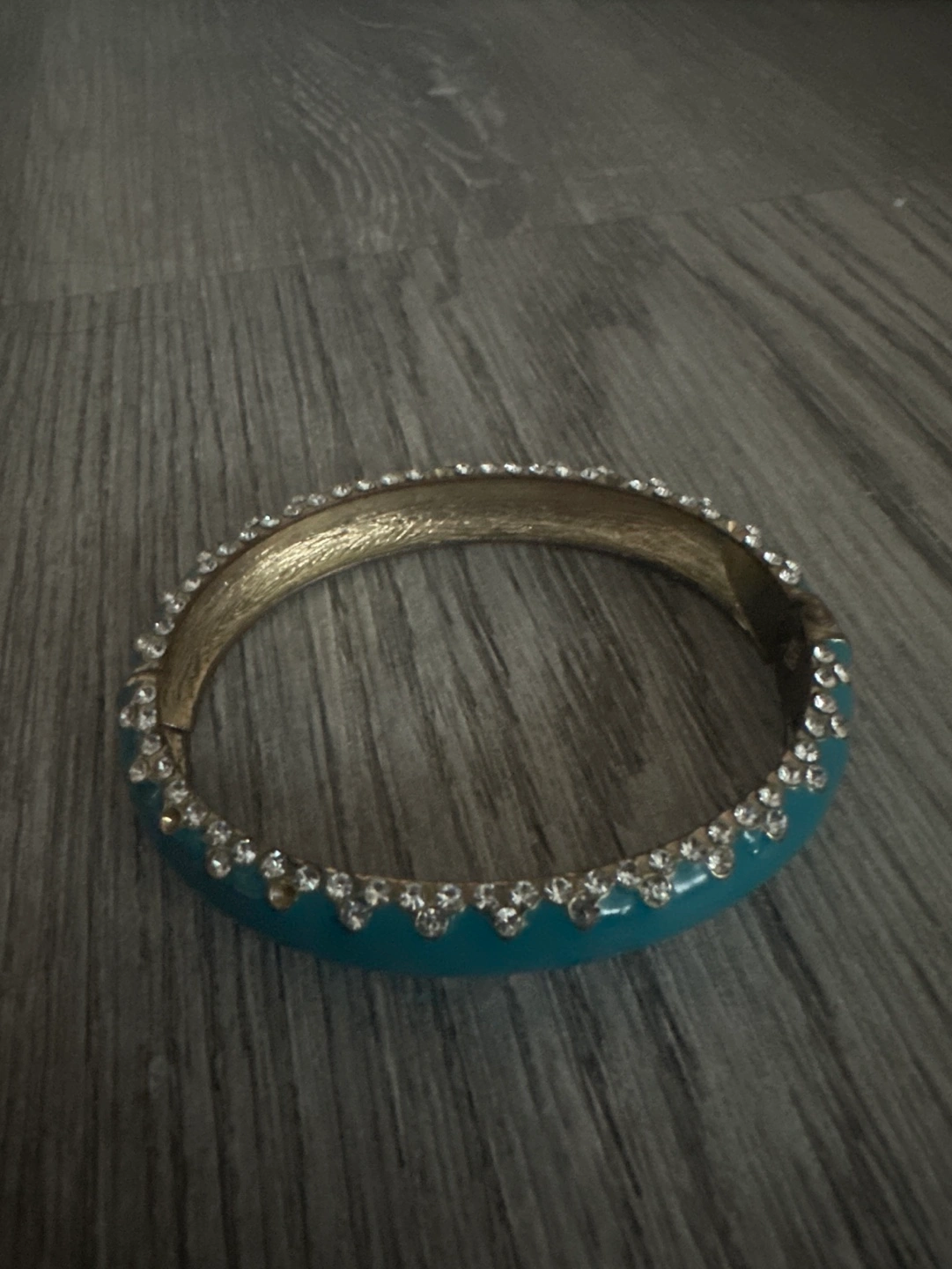Teal enamel costume bangle with clear rhinestones on the outer edge and a gold colouring on the inside. Has a hinge closure.