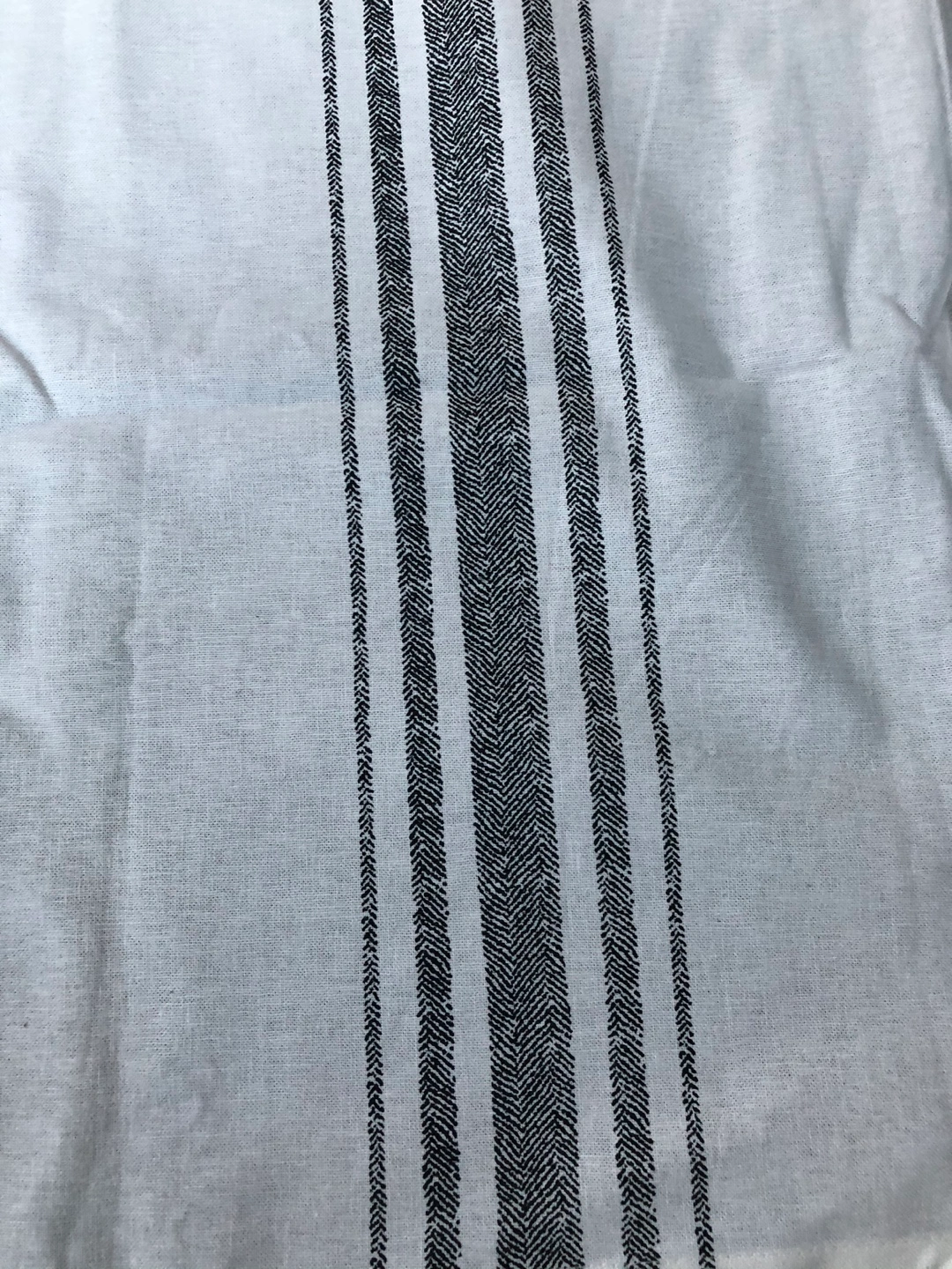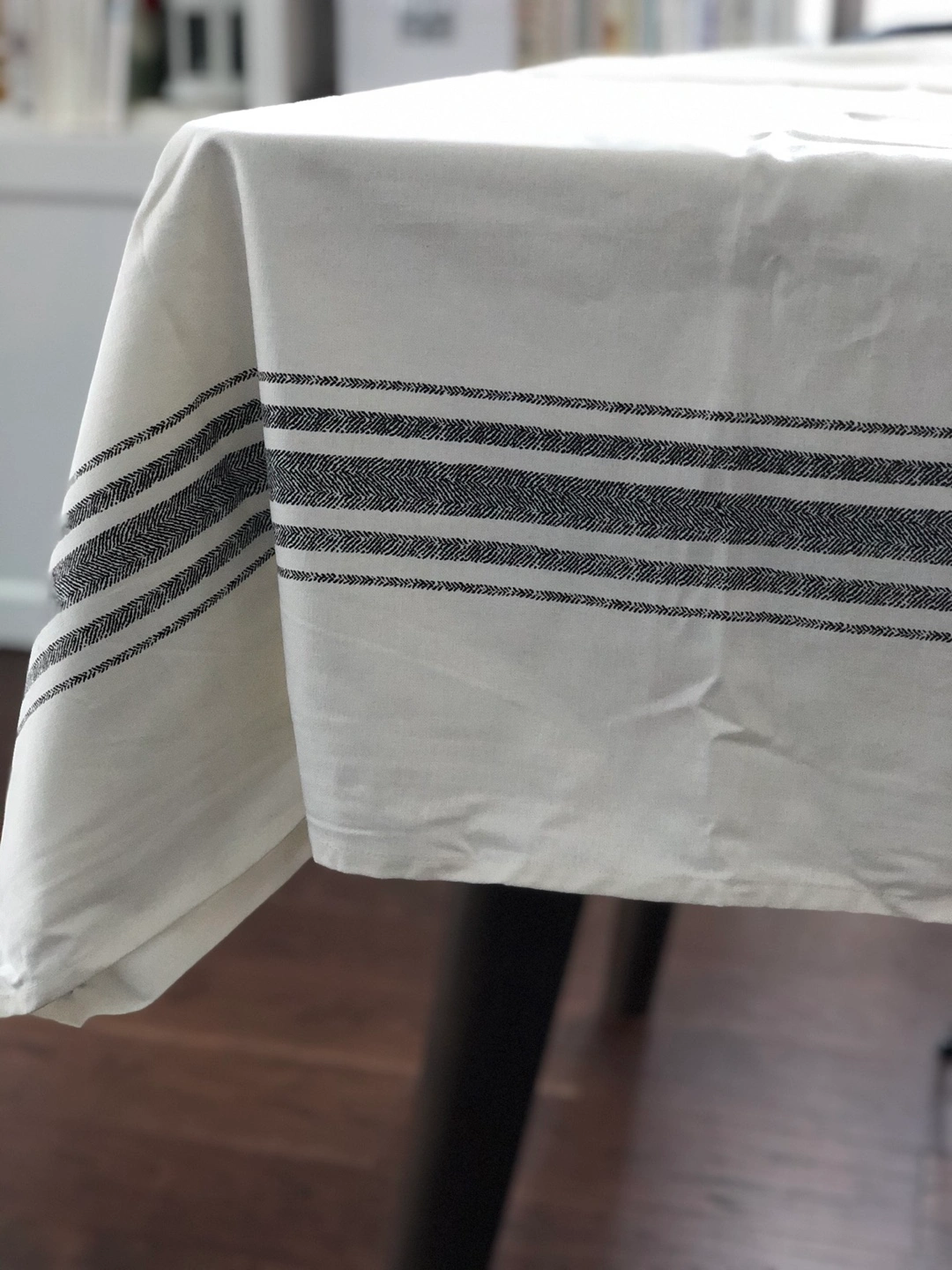 White tablecloth with black striped design. Measures 145 cm by 200 cm. 100% cotton. Made in India.