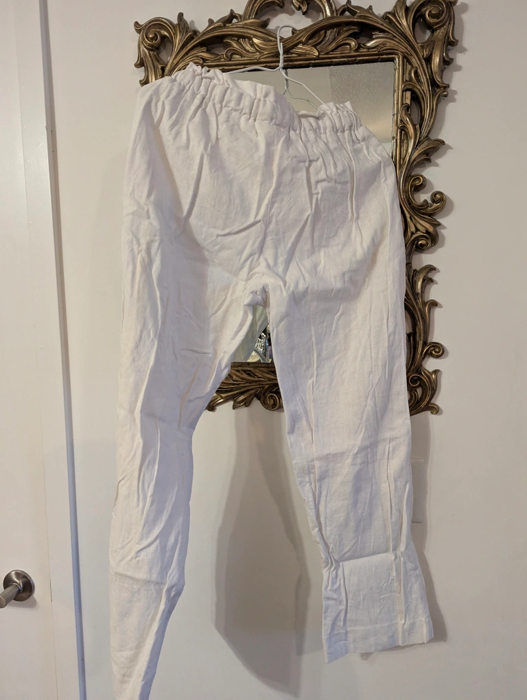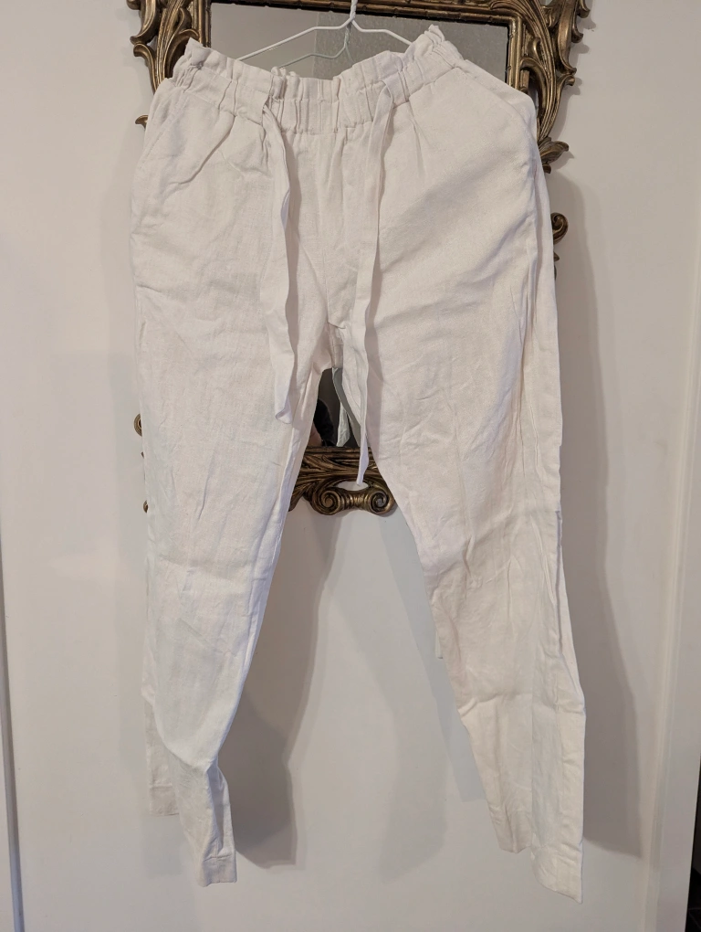 Never worn, 100% White linen pants with an elastic waistband, front pockets and drawstring. Length is to my ankle bone (I'm 5'5"). I got them from when I travelled to Vietnam but never wore them!