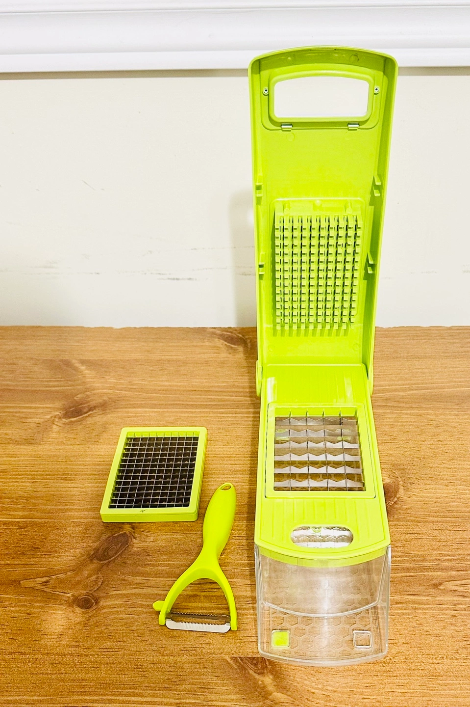 Vegetable Chopper Cutter and slicer with multiple blades and a peeler. Includes a container for catching slices. Brought in June 2024. Moving out of Country.