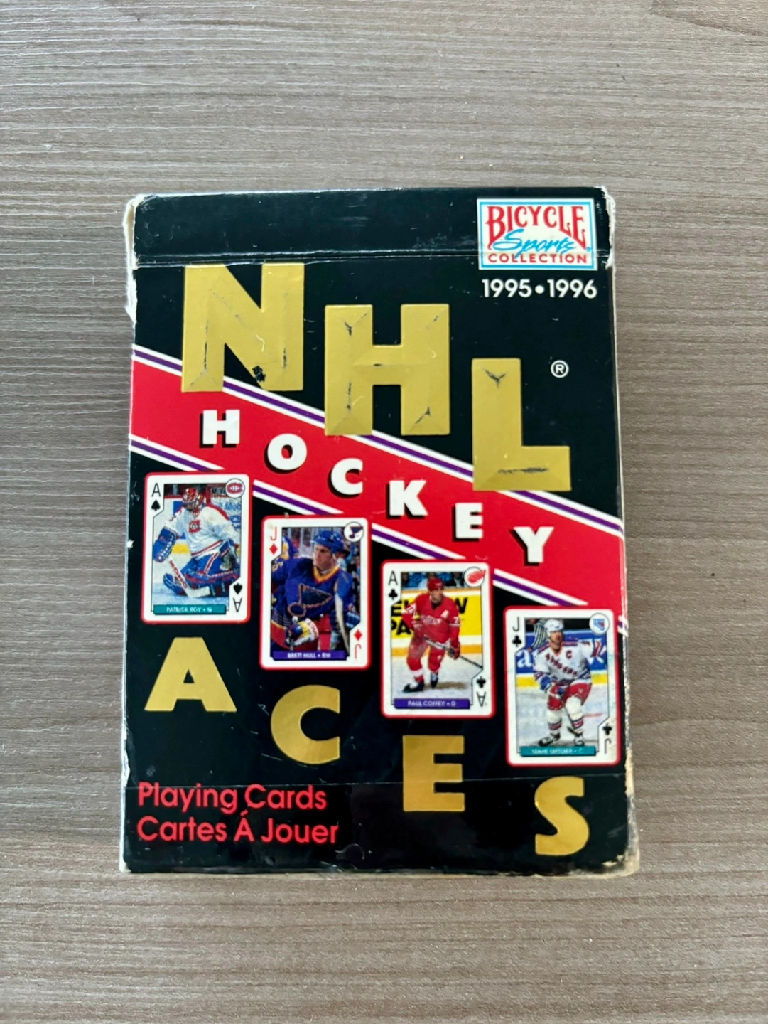 Bicycle brand playing cards featuring NHL players from the 1995-96 season. Cards are all in very good condition. The box is in fair condition.