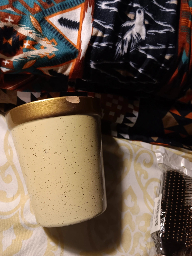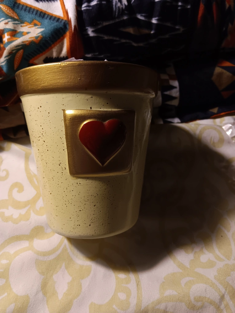 Small ceramic planter with a gold rim and heart design. Perfect for succulents or small plants.