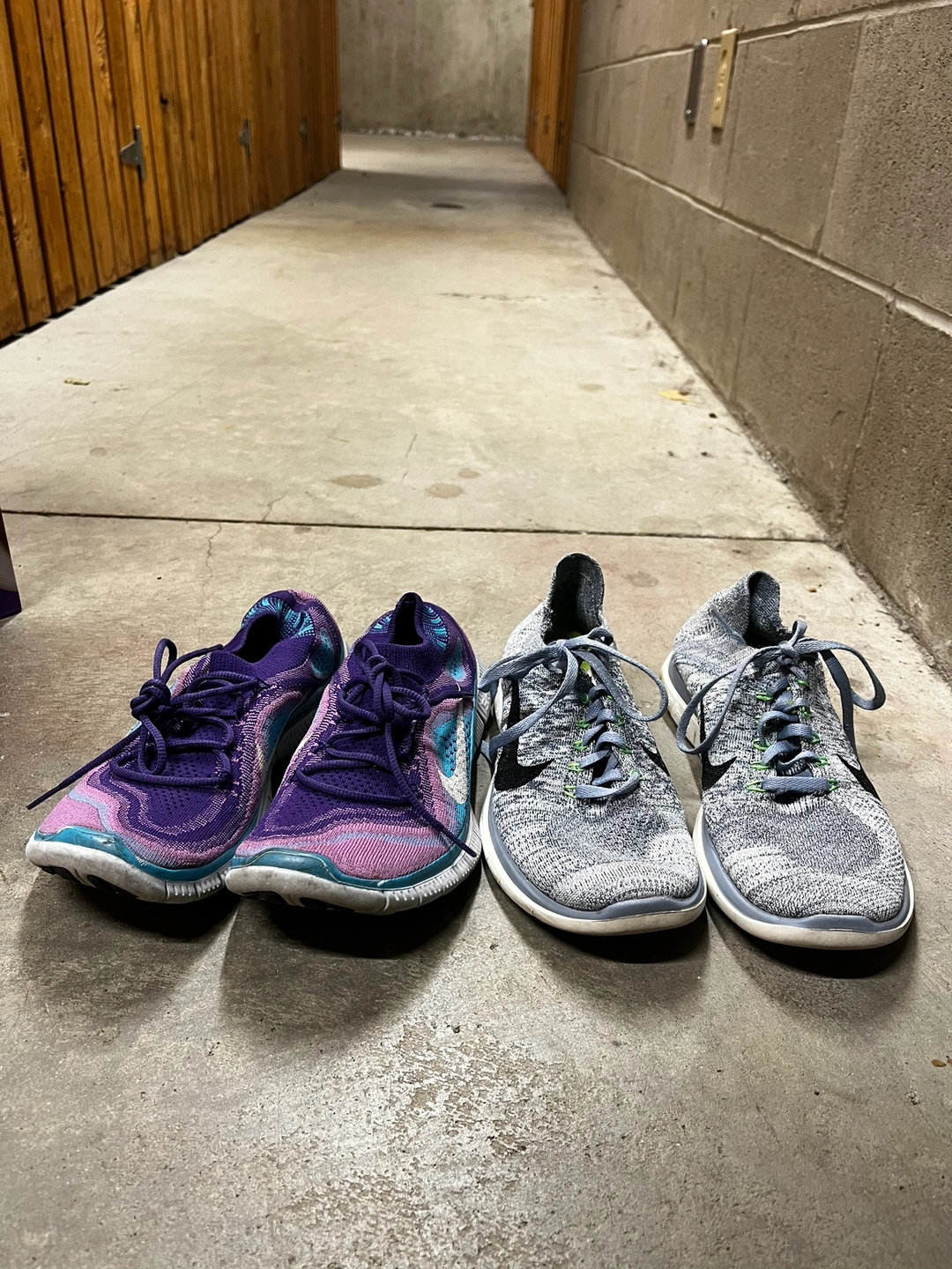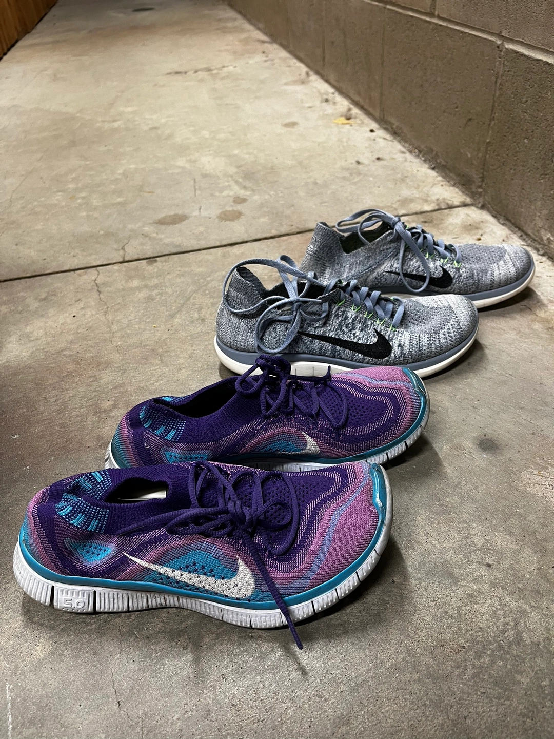 Two pairs of Nike Free running shoes in grey/green and purple/blue.