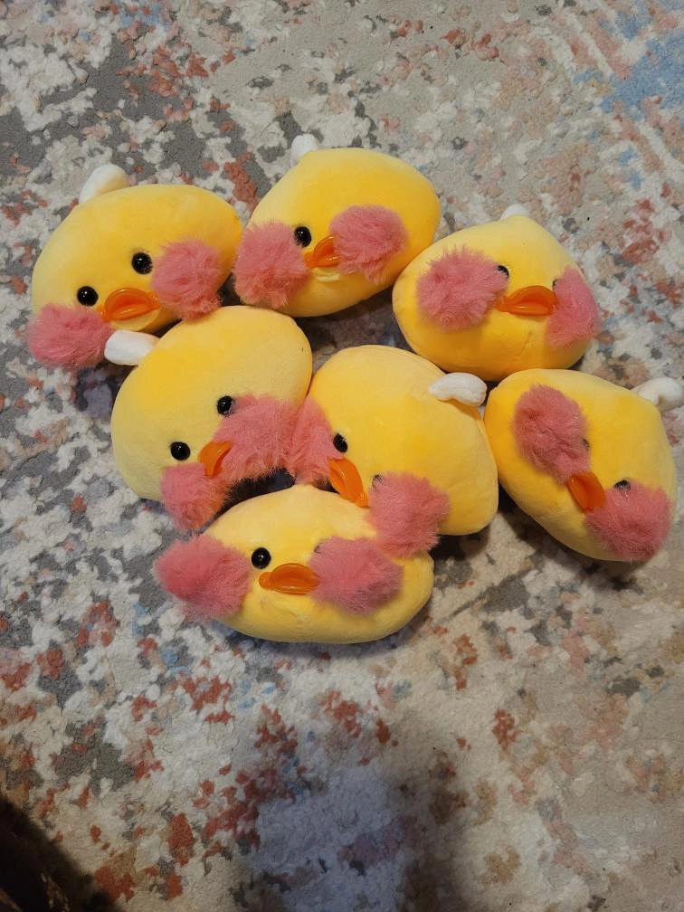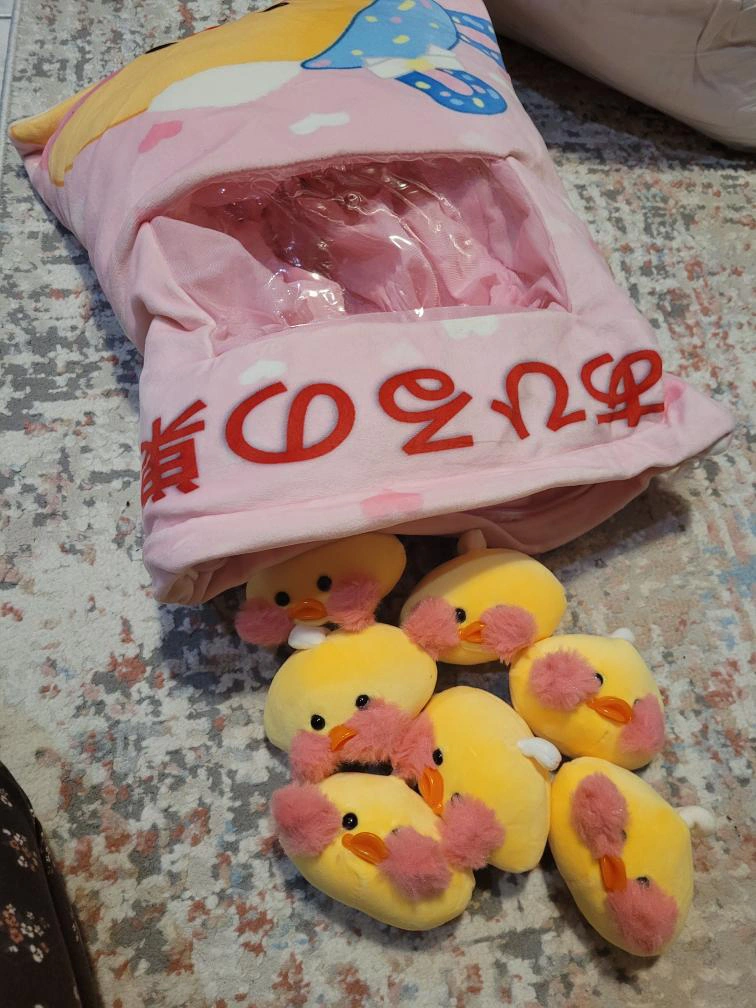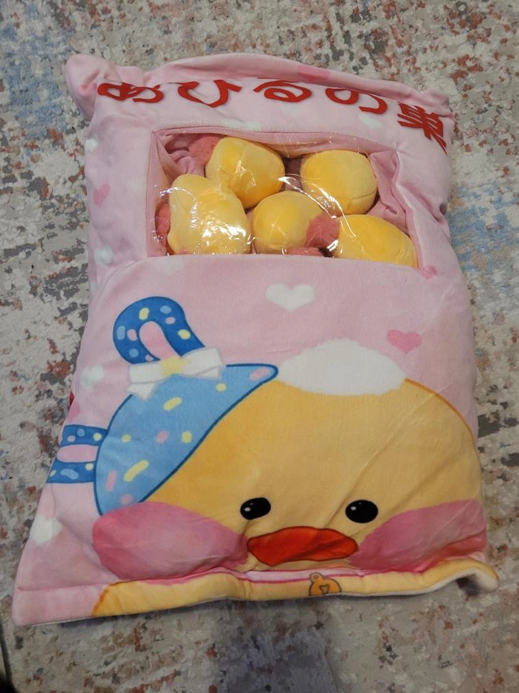 Large pink pillow with yellow duck face on front. Contains six smaller yellow duck plushes. Features clear plastic window on front side. Pink and white hearts on fabric.