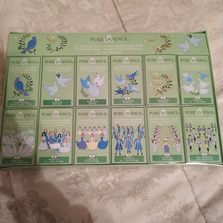 1000+12 Days of Christmas aromatherapy soap gift set. Includes twelve individual soaps.