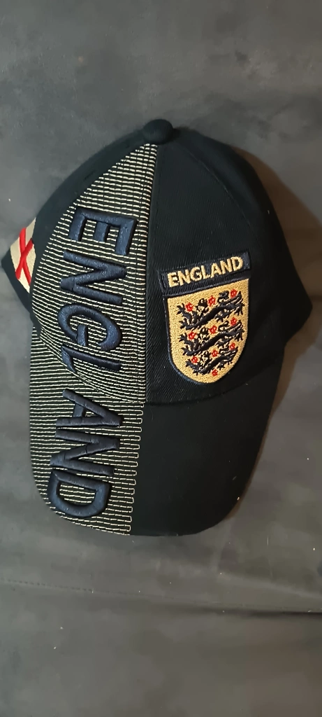 531Navy baseball cap with an England crest and the word England on the side. Adjustable strap. All embroidery . Velcro closing at back with England on it