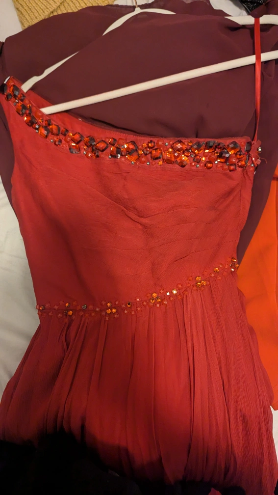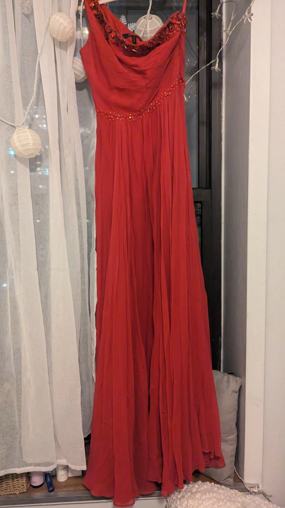 One shoulder, long, red gown with beaded waist and neck line. Flowy, light fabric with lots of volume and drama!