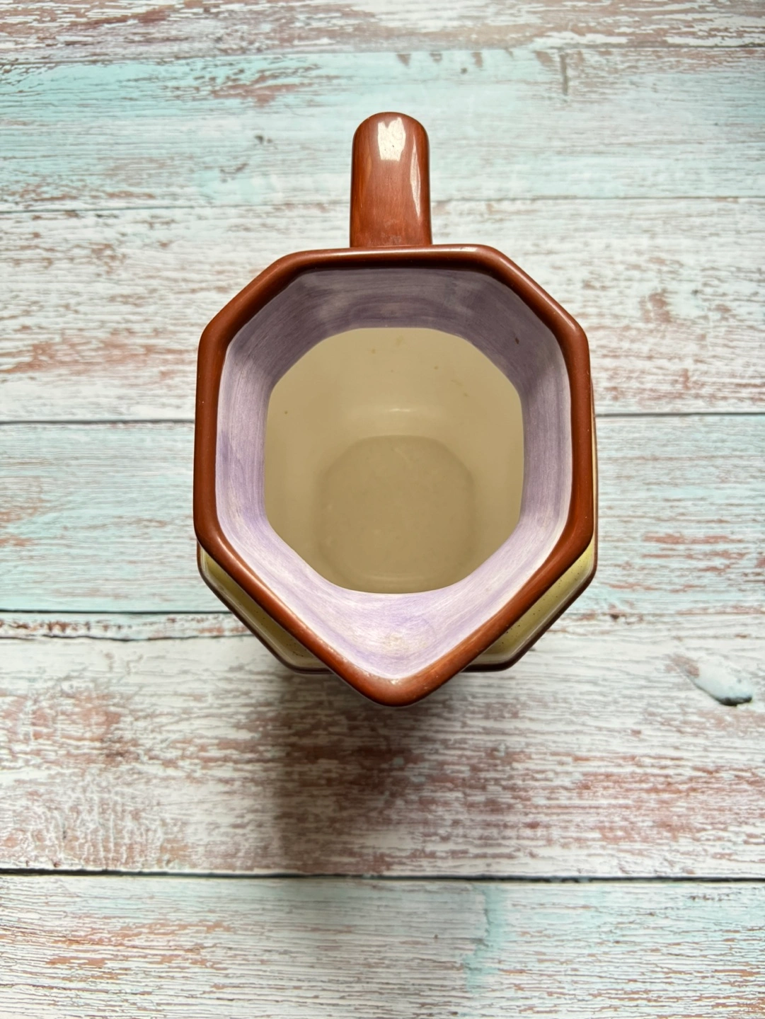 Vintage ceramic pitcher with a fruit design. Yellow, orange, purple, and brown colours. Suggested use: utensil holder or decor.