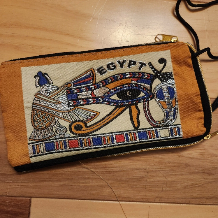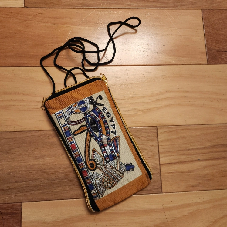 269Small crossbody bag with an Egyptian Eye of Horus design. Has a zipper closure and an adjustable strap. This bag was from Egypt.