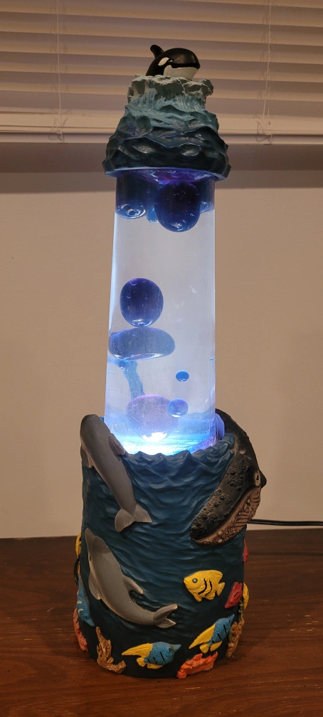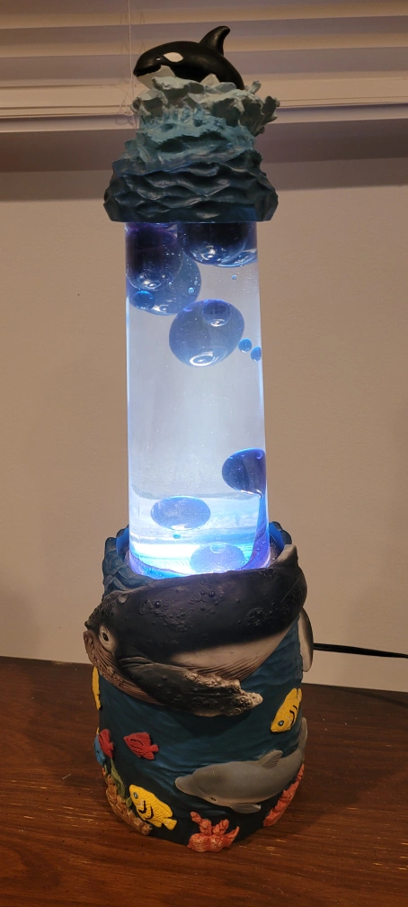Ocean-themed lava lamp with an orca whale on top and various ocean creatures on the base. Includes a light. Originally purchased at the Vancouver Aquarium.