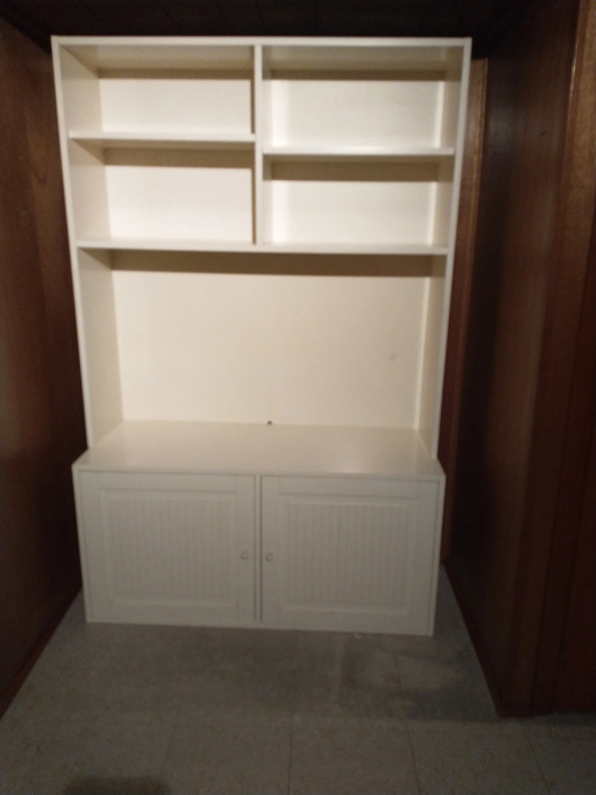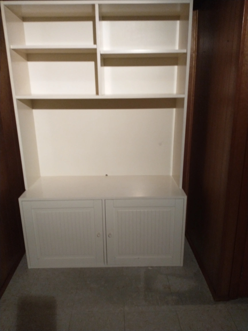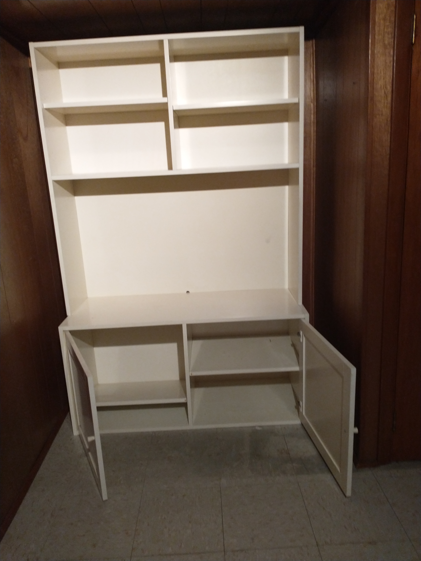 Tall white bookshelf with two shelves on top and two doors with a shelf on the bottom. Cabinet doors are louvred. Entertainment unit can put a TV.