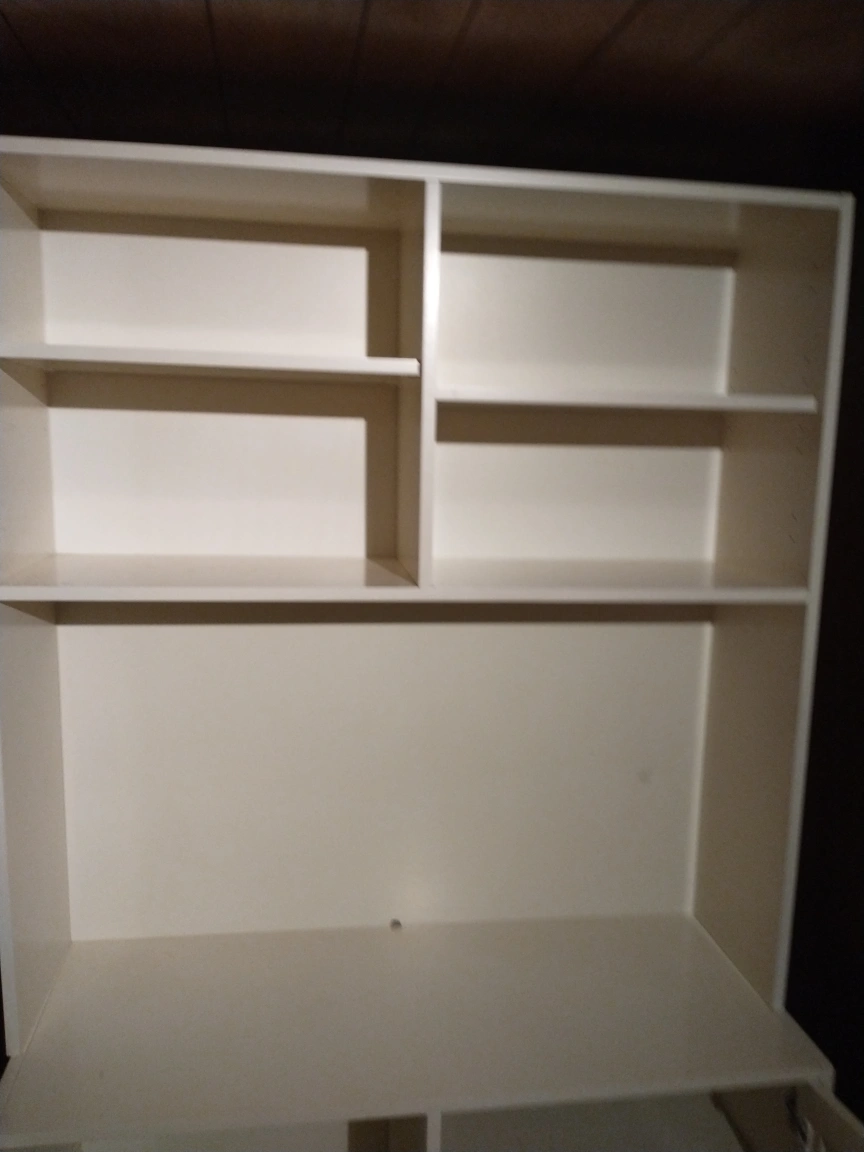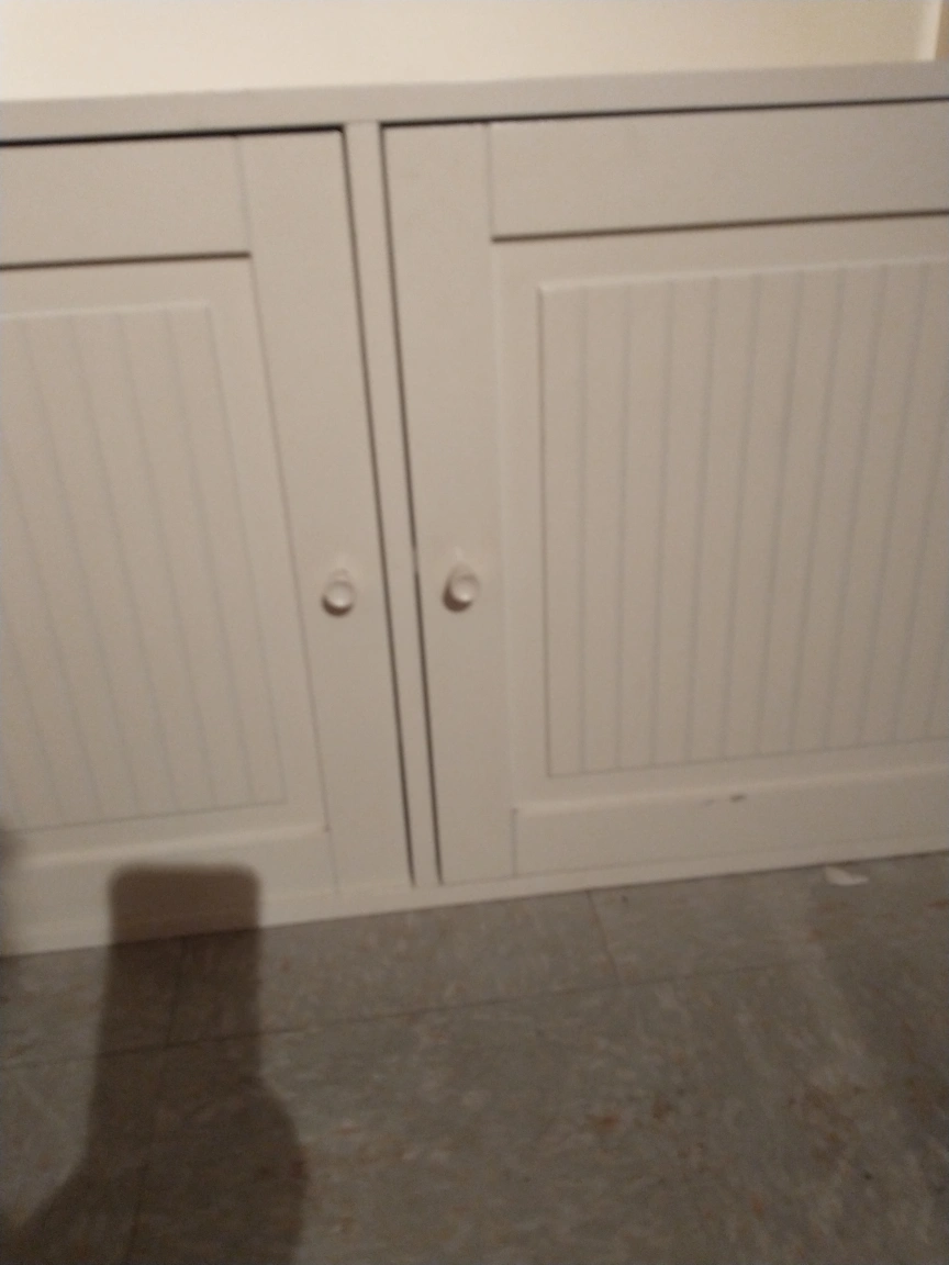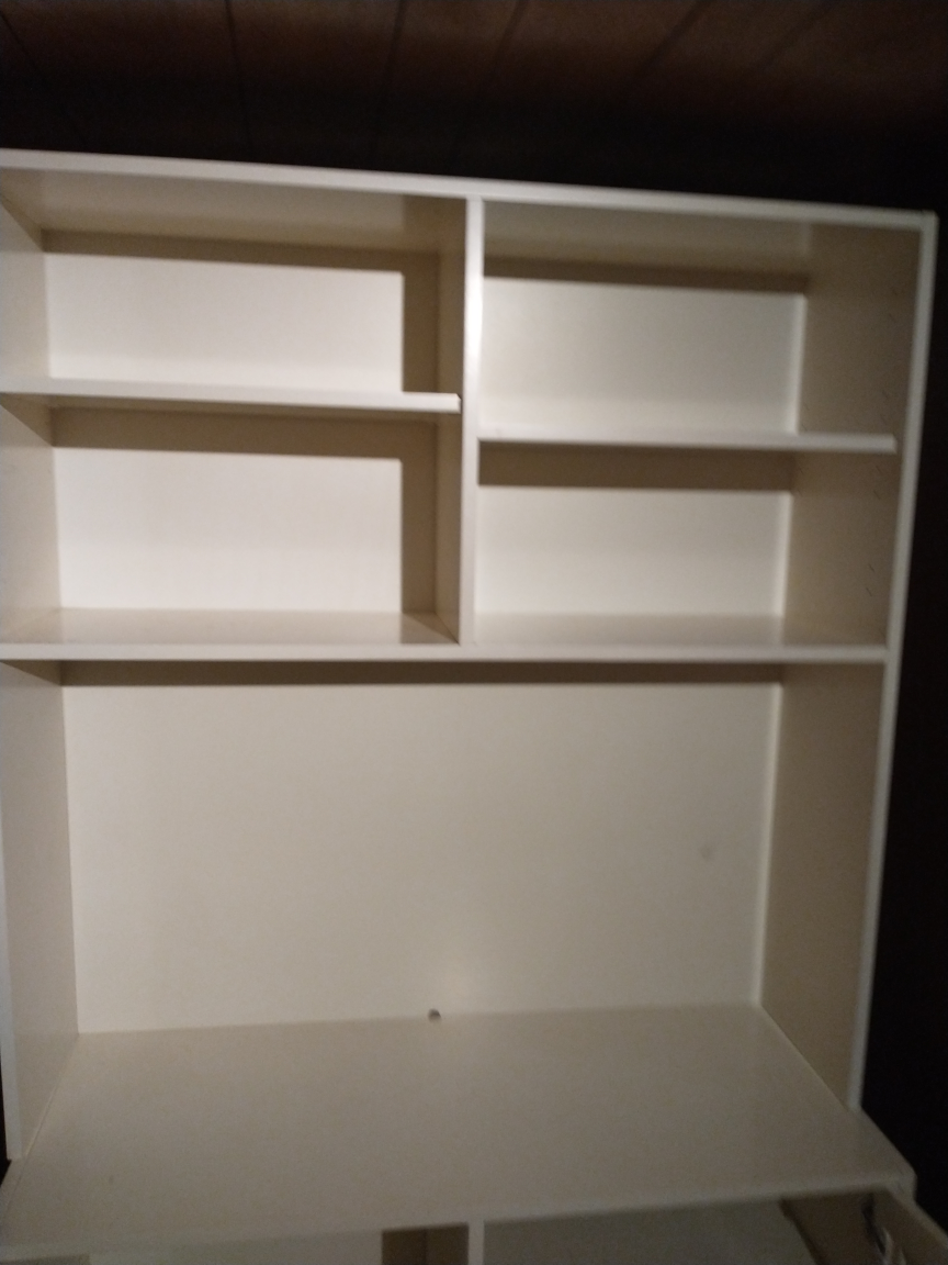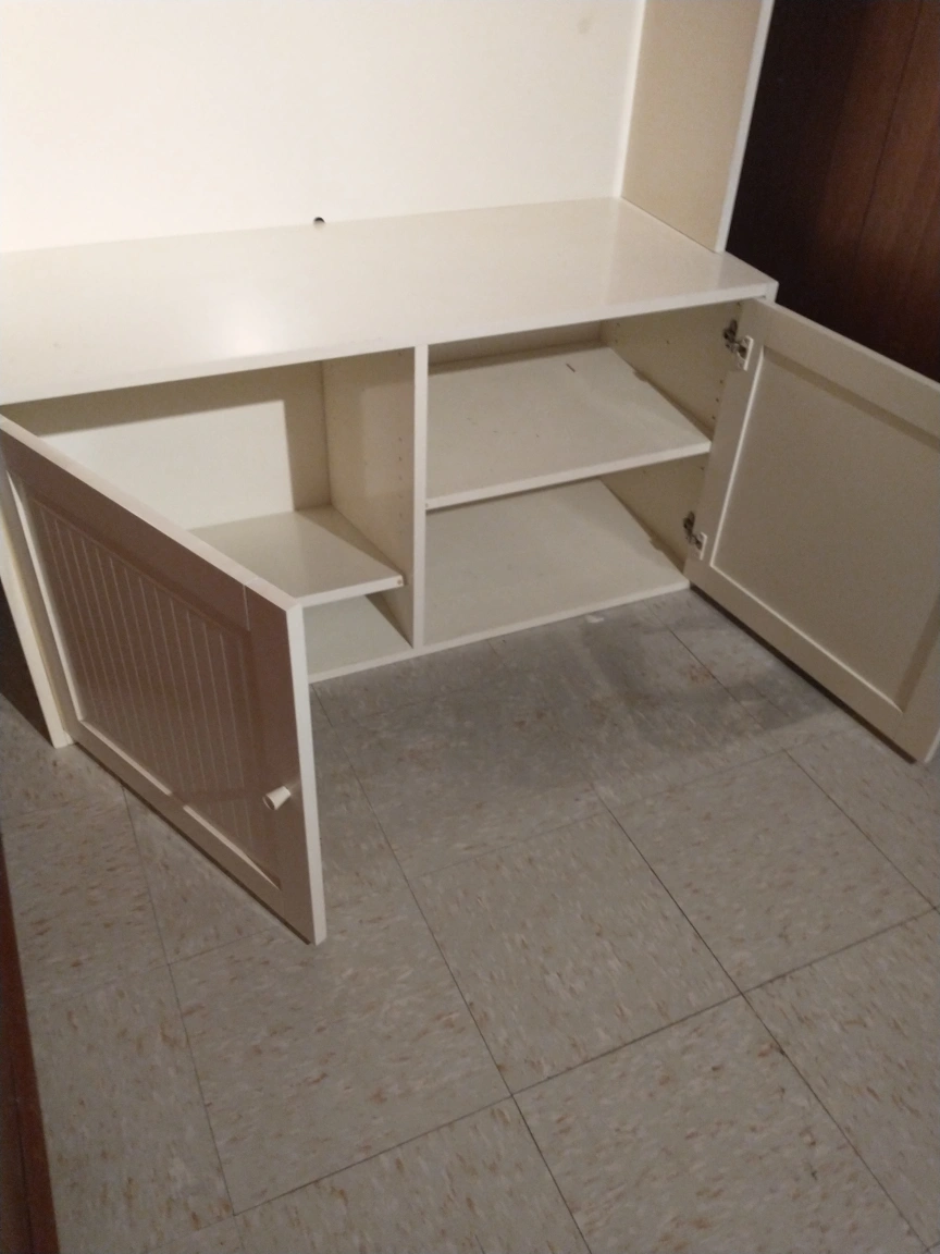 Tall white bookshelf with two shelves on top and two doors with a shelf on the bottom. Cabinet doors are louvred. Entertainment unit can put a TV.