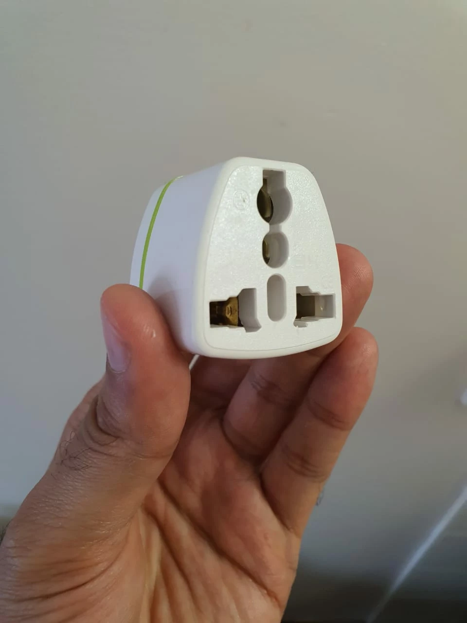 White travel plug adapter with green accents. Converts plugs to a different type. Has a small hole on the side.