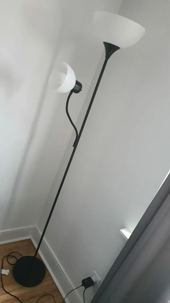 Black floor lamp with two shades, one large and one small. The lamp is in good condition and has been used for about a year. It comes with a cord and plug.