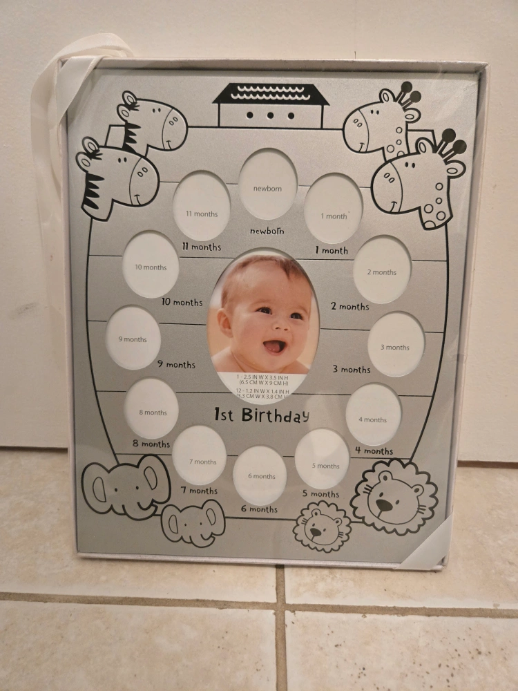 Baby photo frame with spaces to insert pictures from each month of the first year, numbered 1 to 12, plus a space for the first birthday picture. Features animal designs.