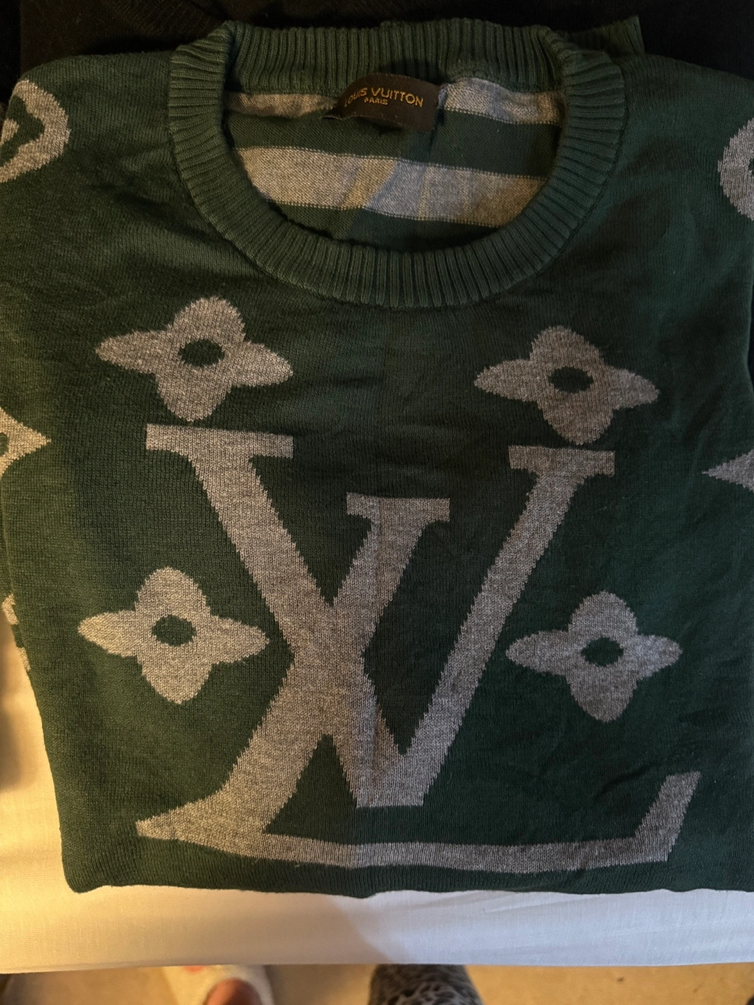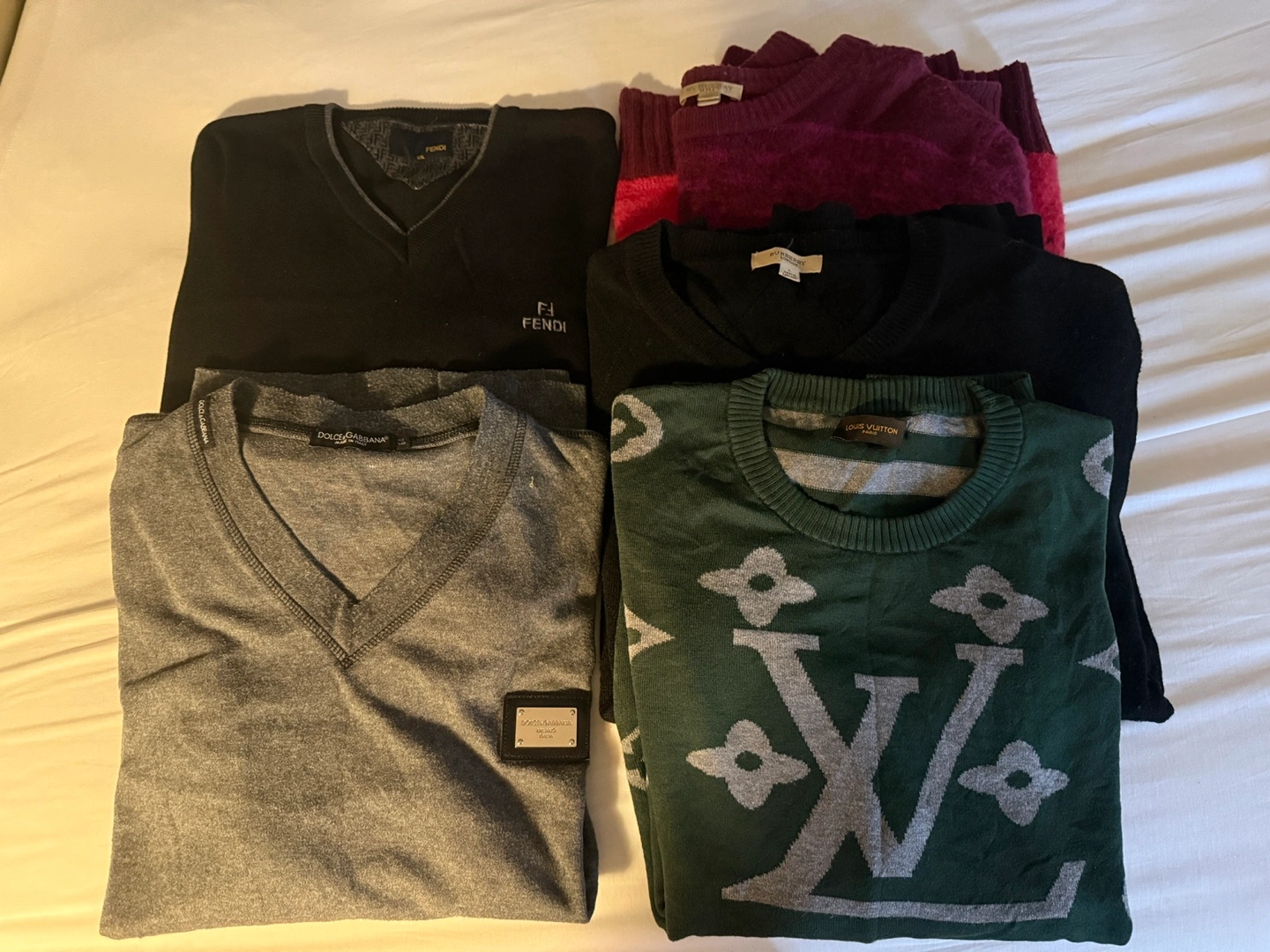 Six men's sweaters. Includes a black Burberry sweater, a green Louis Vuitton sweater, a black Fendi sweater, a grey Dolce and Gabbana sweater, a black sweater with a white stripe, and a burgundy sweater. All sweaters are in good condition.