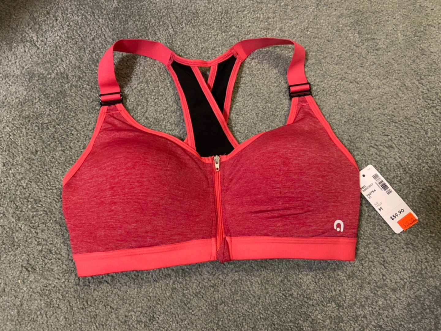 New with tags. Front zip sports bra. Size M. Pink and black. Retails $60, selling $30