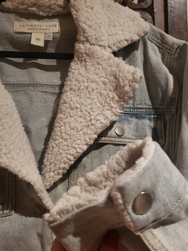 1000+Light wash, distressed denim jacket with a sherpa collar. Multiple pockets. Great condition.